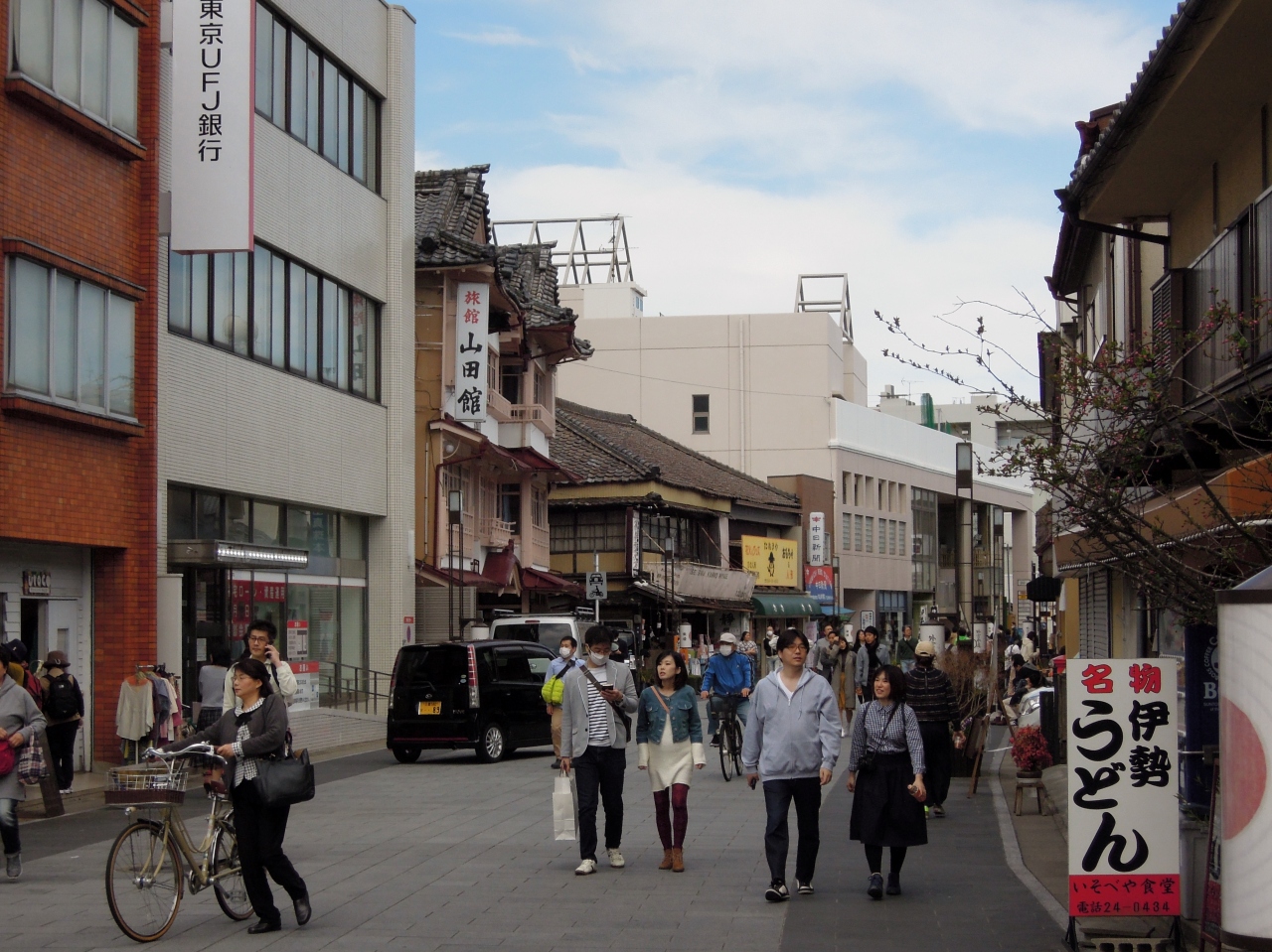 伊勢市駅から外宮にアクセスする参道だ。古い門前町を想像していたが、どっこい新しく、沿道の店も店というよりショップという感じだ。食べ歩きなどアトラクション的な要素も満点。最近、再開発したのではないか。「お伊勢参りは外宮から」という古来からのしきたりに習うと、ここがお伊勢参りの玄関口だ。伊勢市駅前の鳥居がいい。