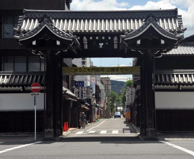 西本願寺御影堂門の一直線上に堀川通を隔てて門前町に建つ門だ。少し変わった立地が目を引く。地名で言うと堀川正面の交差点にあることになる。乗用車が自由に門を通り抜けるとともに、門の向こうに仏具店の看板が軒を連ねる風景は一種独特。