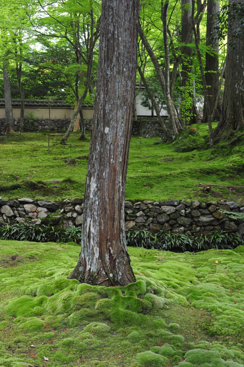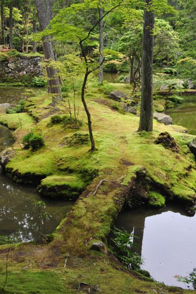 学生で京都に住んでいた4年間、いつか行きたいと思っていた。自由に拝観できない。そのことが、京都に住んでいないと行けないのではないかという固定観念につながっていた。卒業してから四半世紀。もう無理だとあきらめていたが、妻の応募が通った。六月の梅雨時、青もみじの最盛期に訪れることができた。さまざまな形の苔が各所にじゅうたんのように広がる。苔の幽玄さがしみいるようだ。見学には「般若心経」の写経が必須となっていたが、学生の時だったら、これは苦痛だったかもしれない。今だからこそ、写経も庭も堪能できる。卒業からの四半世紀は、この寺院を満喫するのに必要な時間だった。駐車場を心配していたが、近くのコインパーキングが空いていた。