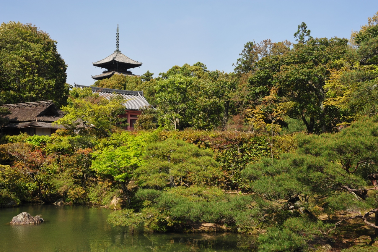 遅咲きの仁和桜も散った後、青もみじの季節に訪れた。御朱印をお願いすると本尊の「阿弥陀如来」と「御室御所」の二種類が頂ける。御所の名は天皇が動座した歴史があるからだ。建物も落ち着きと品性がある。庭には左近の橘、右近の桜があった。