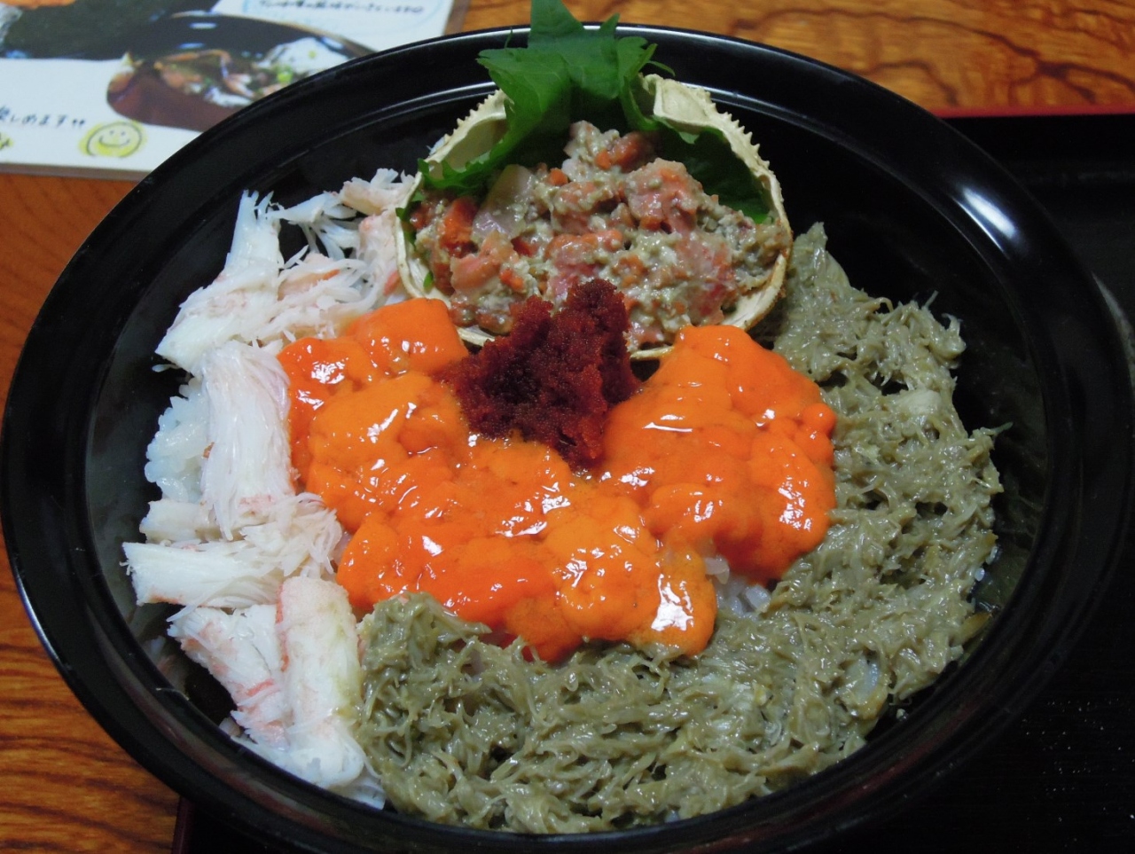 ここの親ガニどんぶりは最高だ。毎冬、松葉ガニ漁が解禁になると、オスの松葉ガニだけでなく、メスの親ガニ(セコガニ)の漁も解禁になる。松葉ガニに比べるとだいぶ小ぶりだが、地元では味だけならば親ガニのほうがおいしいといわれている。小さいのが難点で、よく半分に切ってみそ汁のだしにされている。要するに処理が面倒くさいのだ。このどんぶりのすごいところは、その処理を精緻にやり遂げているところだろう。身、みそ、内子、外子などをおそらくは根気よく分類し、一つのどんぶりの中に盛り付けている。親ガニをこんな風に食べたらさぞかし幸せだろうな、というどんぶりだ。親ガニの味の濃さが、見事に再現されている。カニを食べ慣れた地元民でも、これはすごいとうなる。ただ、シーズンが二か月ほどしかないこと、毎年値上がりしていることが残念。冬の一瞬しか堪能できない。