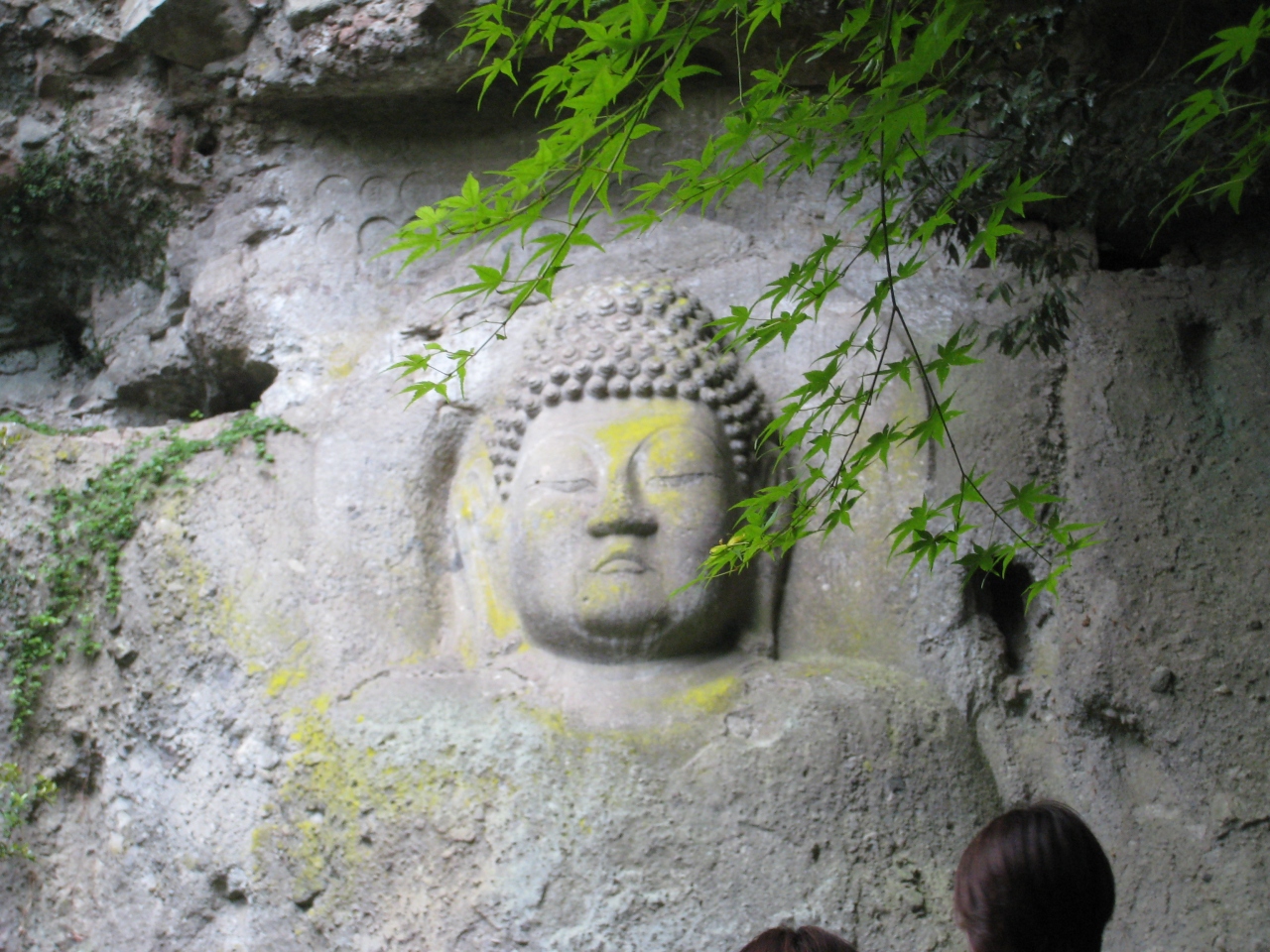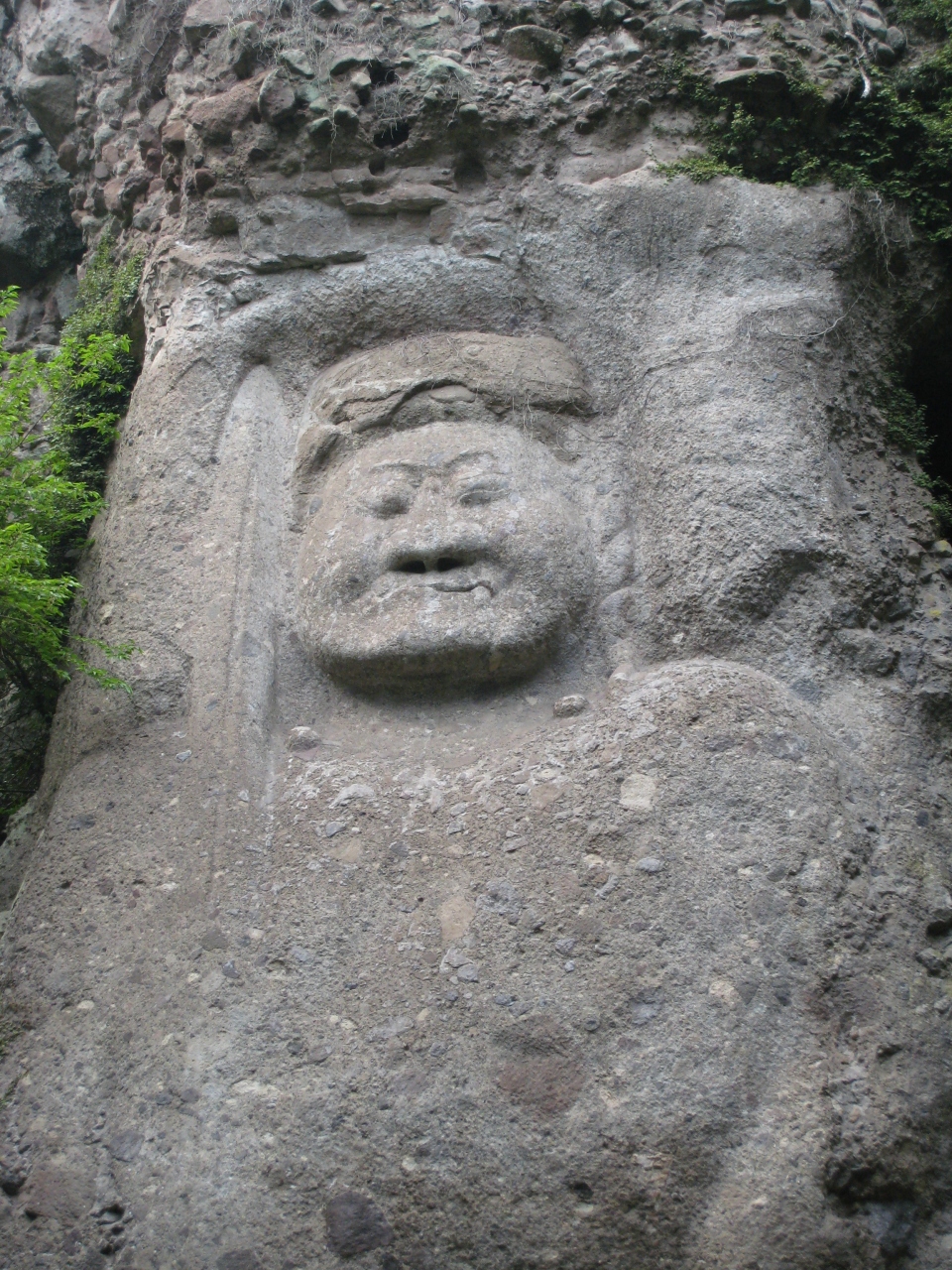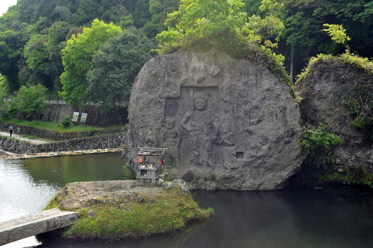 川の中に磨崖仏のレリーフが彫られている。正確には長岩屋川の巨岩に高さ3メートル以上ある不動明王が浮き彫りにされているのだ。なぜ、こんな所に掘ったのだろうか。言い伝えだが、長岩屋川の水害から人々を守るためだという。周辺は六郷満山の札所である天念寺の門前で、少し下流の駐車場から親水整備がなされており、涼しげな場所だ。ただ、天念寺が無人であることから、やや荒れた風情が漂う。それが、残念だ。