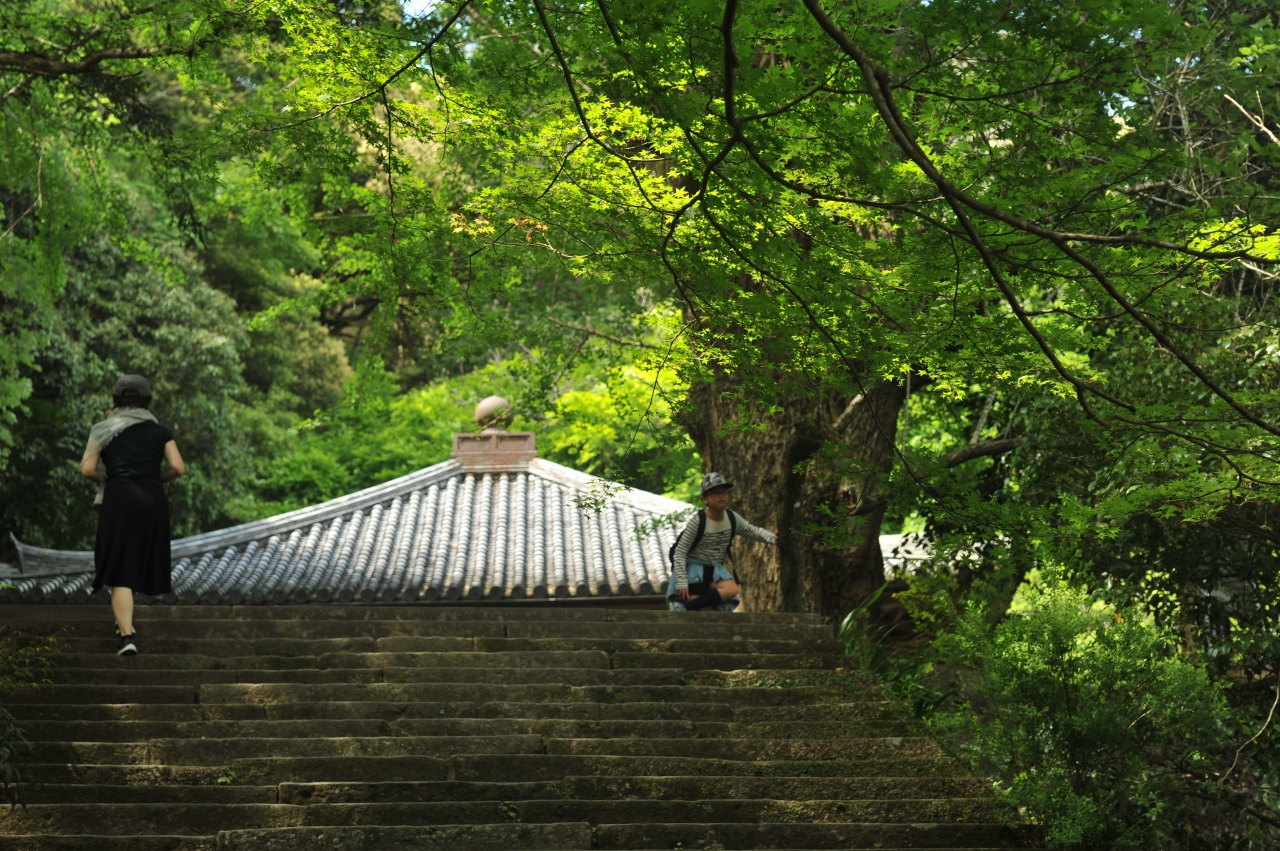 この左右対称の静謐さはどうだ。清冽さはどうだ。お堂の真っ直ぐな線が自然の中にある風景は心洗われるぐらいに美しい。終わりに向けて暮れなずんでいくような紅葉の季節も、無音の中で厳しさが漂う雪の季節もこのお堂は映えるのだろうが、緑の季節は何か生命の息吹のようなものがお堂に満ちあふれていて、しばしひきつけられる。六郷満山の中でいくつかの印象的な風景があるが、山門をくぐり、階段を上がるとゆっくりと見えてくるお堂の美しさは一生忘れないだろう。