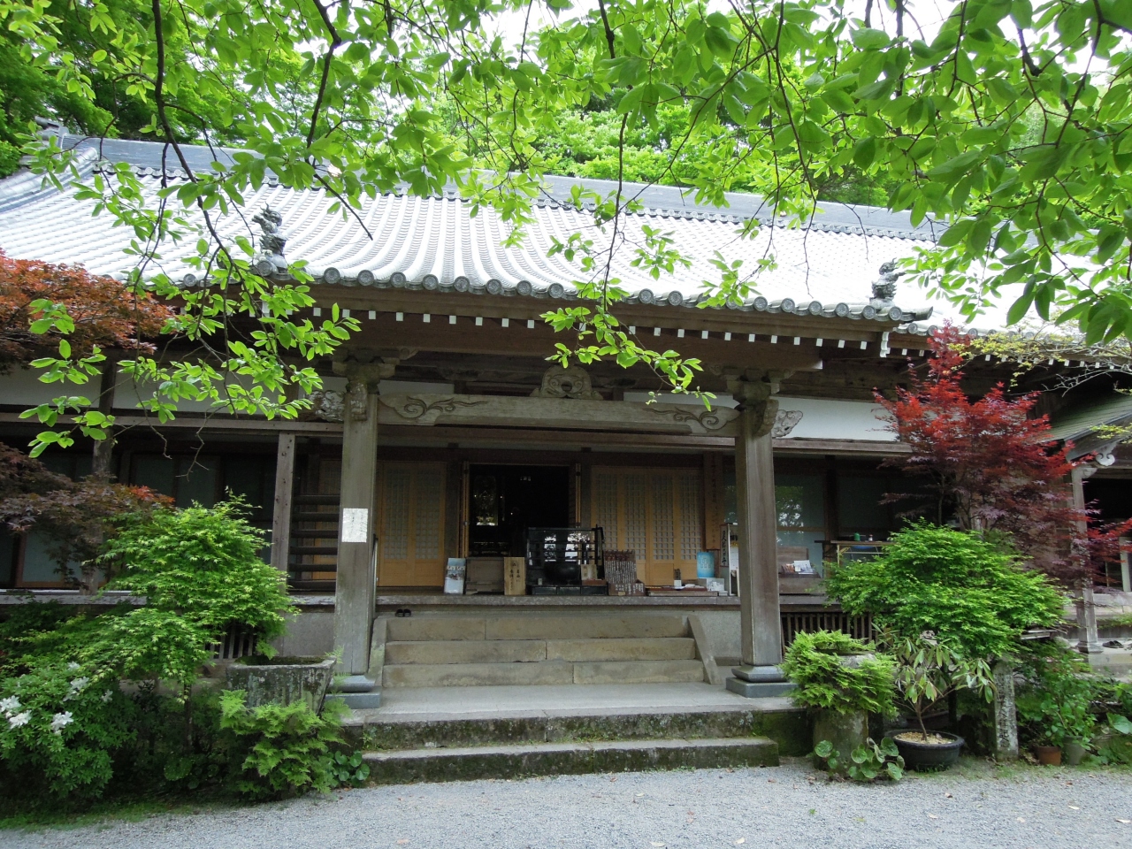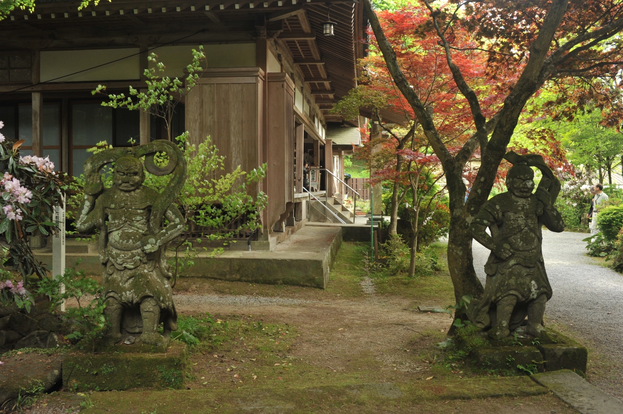 大型連休に訪ねた。駐車場から本堂に向かうと、テントが。その場にいた女性からシャクナゲ園への入園料を求められた。園は見る気はないと断ったが、連休中は入園料を必ずもらっている、とのこと。シャクナゲ園は本堂の裏山。といっても、その裏山が大きく、一帯には多種多様な植物が植わっていた。大型連休時はちょうどシャクナゲが満開を迎えていたようだ。紅葉の時期も美しい寺院だろう。少し小ぶりな阿吽の仁王像が二そろいあるなどユニークな寺院だ。無人の天念寺の御朱印は、このお寺で併せていただいた。