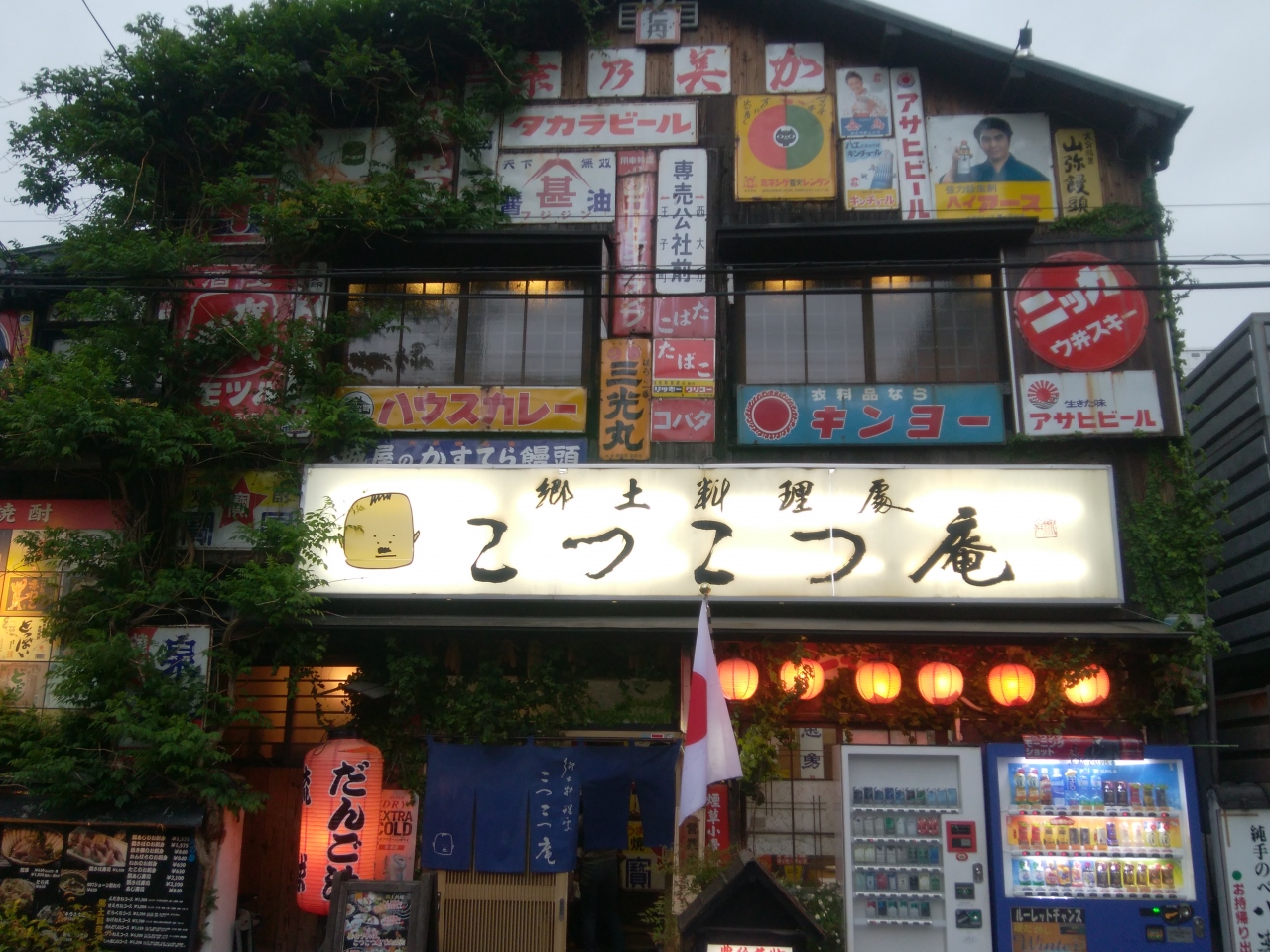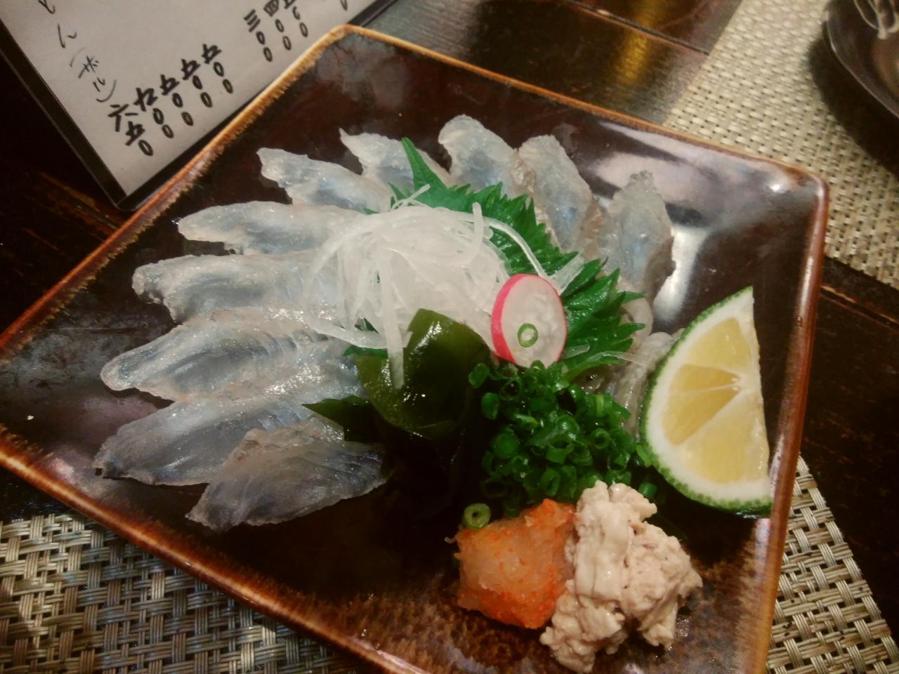 室内装飾のテーマが<昭和時代の懐かしの居酒屋>風で、ホーロー看板が多数壁に貼られているタイプ。ざっくばらんな雰囲気だ。大分の郷土料理が食べられるというので予約して寄ってみた。店内は広く、入り口に個室風のテーブル席、少し入ったところにカウンター席、奥には座敷がありいくつかの座卓が置いてある構成だ。6時過ぎに行ったが、大型連休中だけにすでに城下カレイの刺身は売り切れていた。関アジの刺身、鳥天、馬刺し、シイタケ豆腐などをオーダー。リーズナブルな価格のメニューが多い。煙草の煙が苦手なので、分煙ができていない点は少し残念だが、コスパは高いだろう。