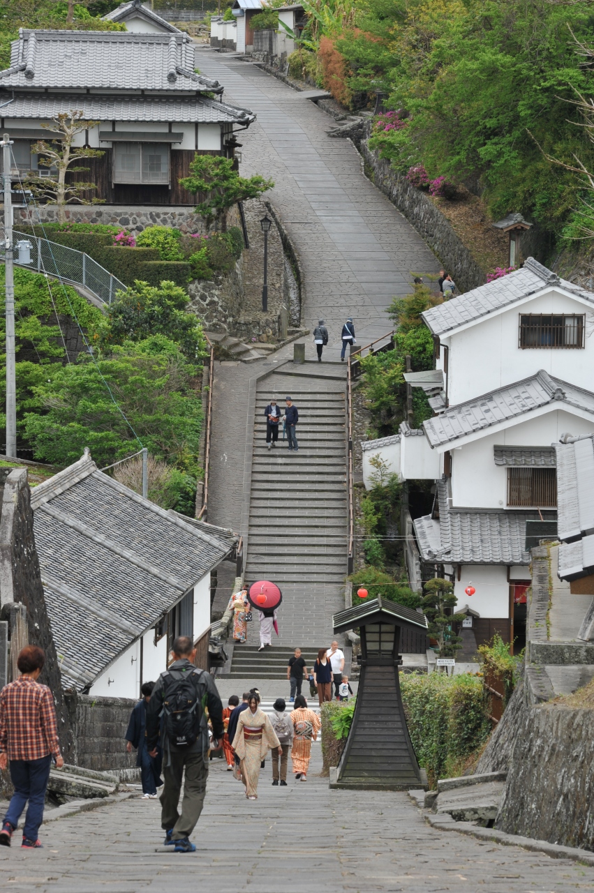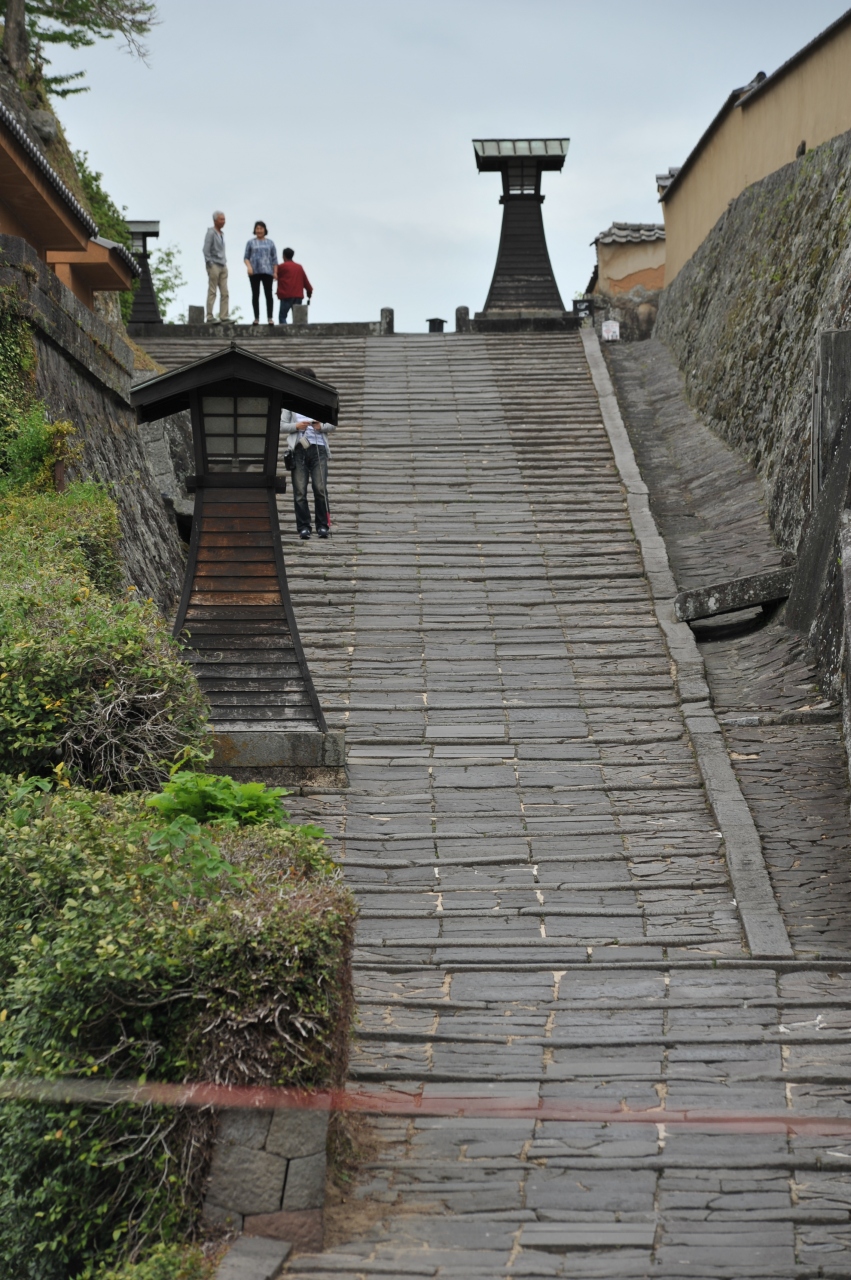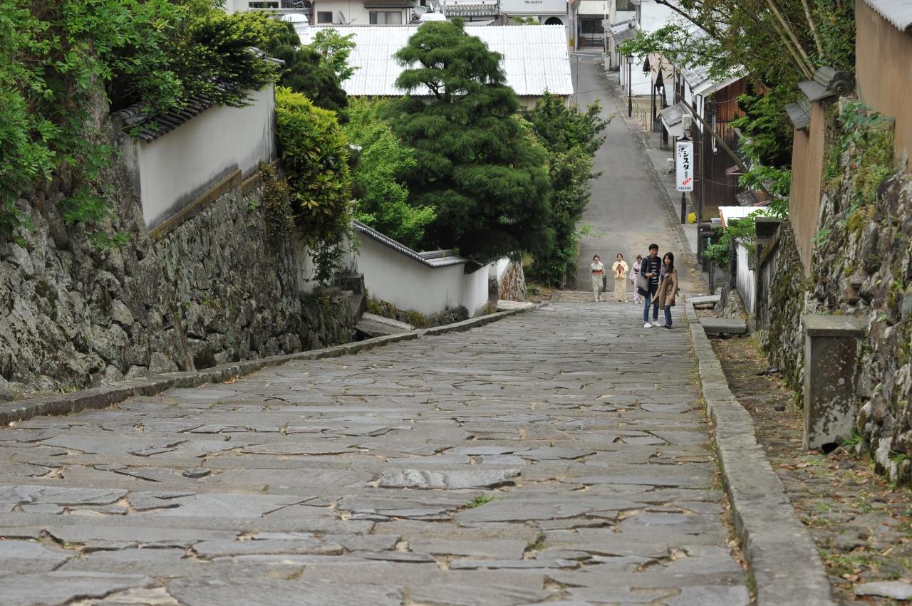 北側の武家屋敷群と杵築城を結ぶ坂であり、金銭を出納したことからこの名がついたという。他の坂と比べて緩やかな傾斜で<ゆるゆる>と往復した。この傾斜は金銭を積んだ、あるいは持った馬や人、かごなどが通りやすいよう幅や踏み面が設計されているという。途中、富士山と湖面に映る逆さ富士が描かれており、にんまりとしてしまった。こうした遊びがあるなら、江戸時代のお役所勤めもなかなか粋だ。