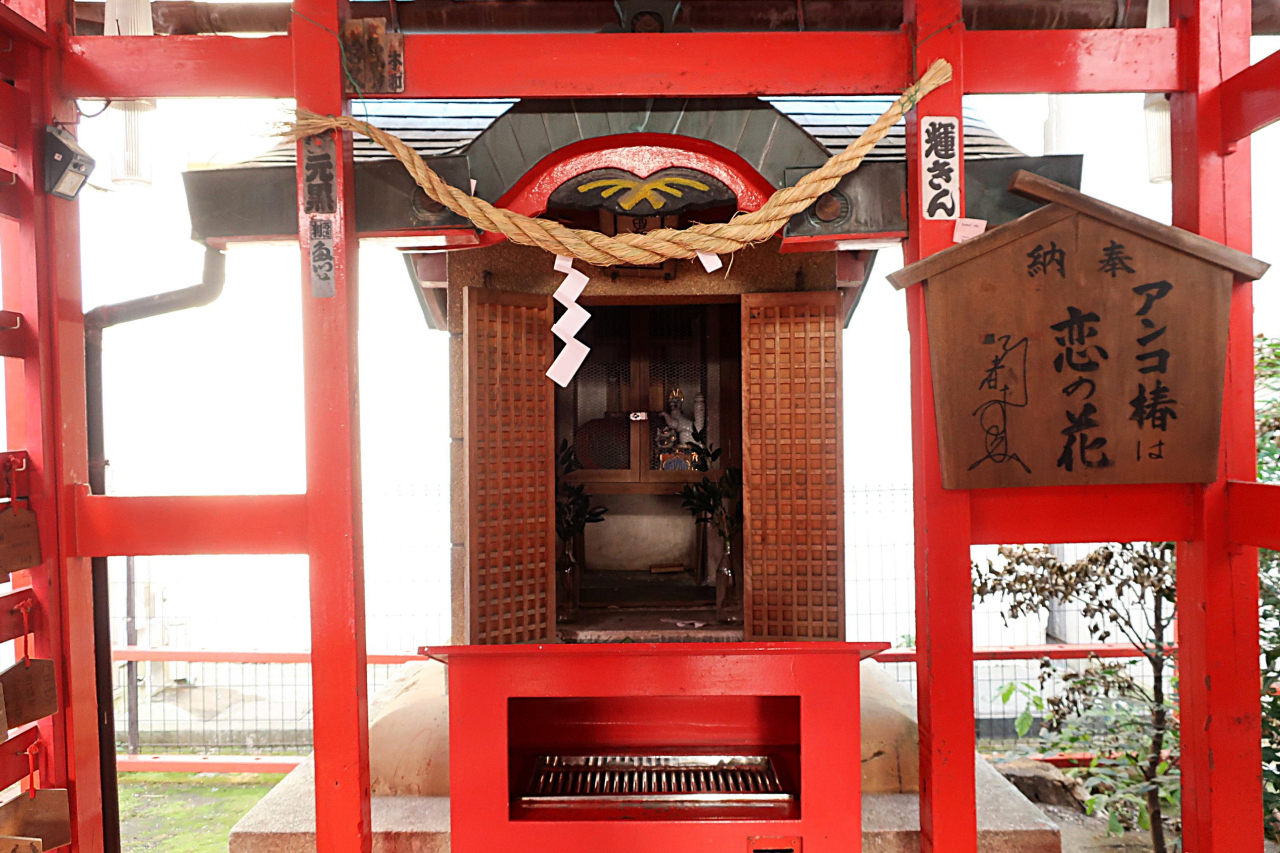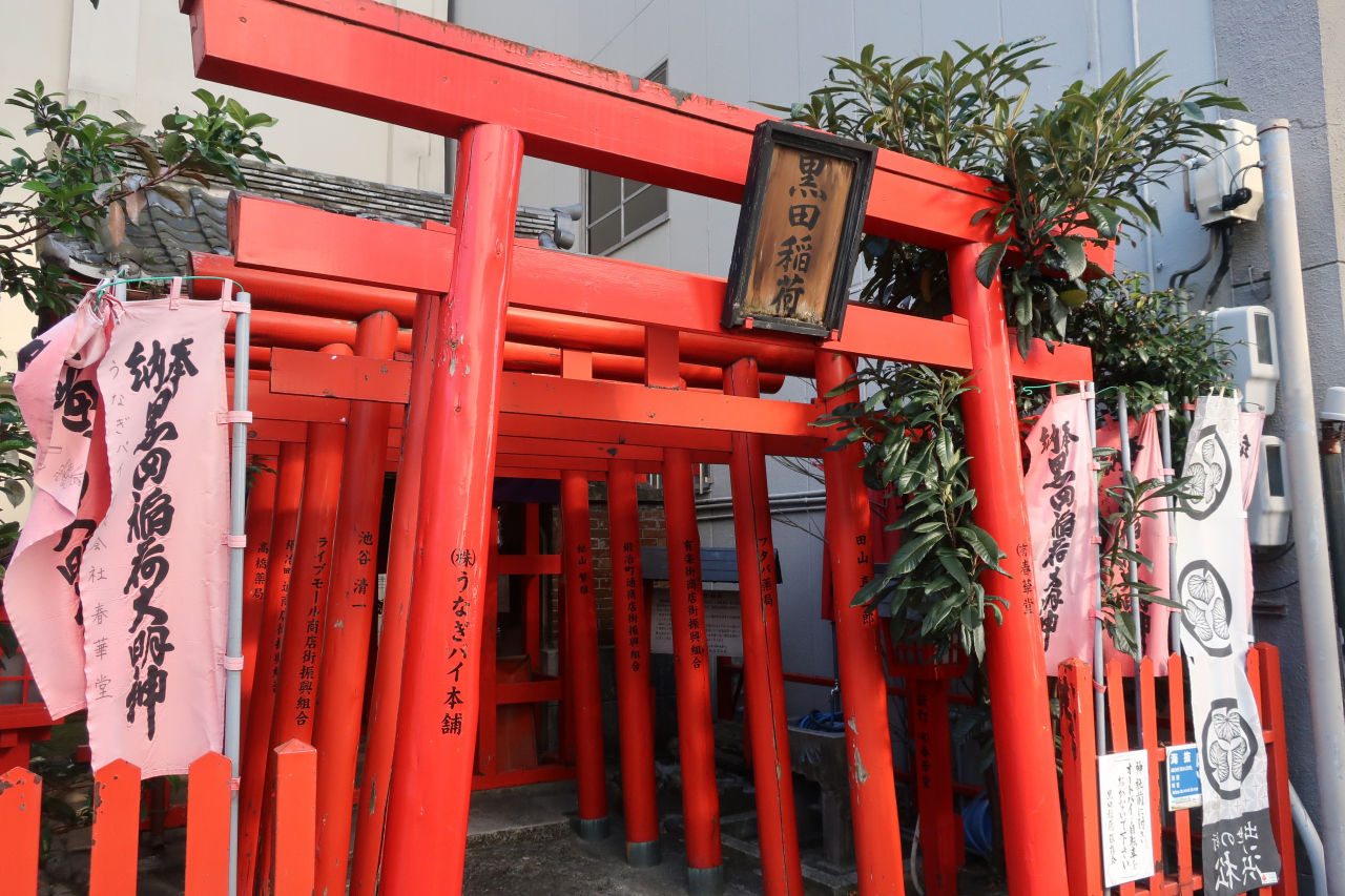 JR浜松駅前に広がる繁華街の中にある小ぶりな神社だ。お稲荷さんなのでご利益は商売繁盛だが、芸能関係にもご神徳があるという。昭和を代表する演歌歌手の都はるみが巨大な絵馬を奉納している。絵馬にはデビューした1964年のヒット曲『アンコ椿は恋の花』の直筆サインが。真偽のほどは不明だが、ある呉服商が黒田稲荷のそばで都はるみのコンサートポスターを見つけ、都はるみに着物を売ろうと思い立った。その後、都はるみはスターダムを駆け上がり、呉服商も「都はるみが買った呉服商」として人気を集めた。神社は芸の出世を助けるパワースポットとして有名になった。そういえば、浜松駅から浜松城に行く「出世街道」沿いにある。