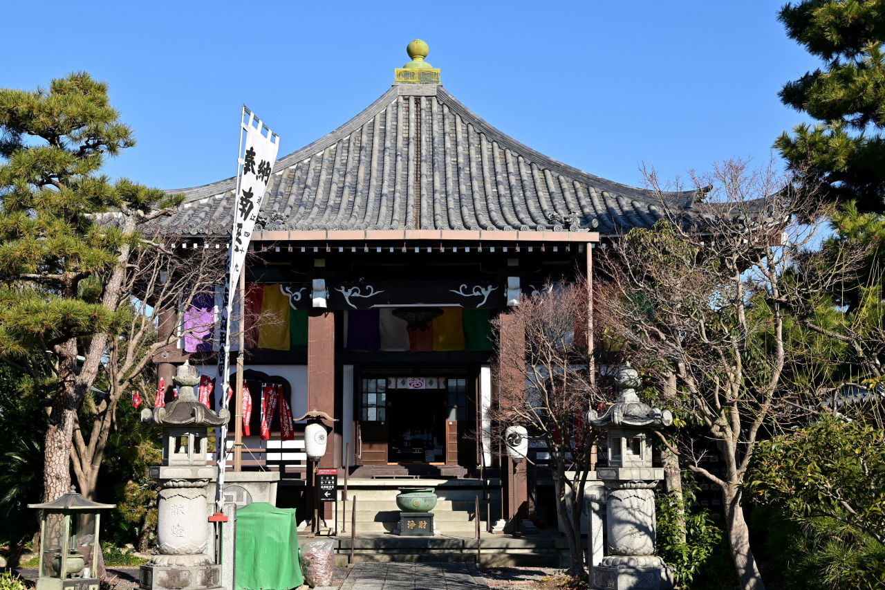 ここには松下氏の居城「頭陀寺城」があったとされ、太閤記で紹介されている秀吉の有名な逸話が残されている。松下加兵衛之網に才覚を見込まれ、松下家に仕えた秀吉だが、周辺の嫉妬を買い、孤立してしまう。之綱は秀吉の才気を惜しみ、あえて暇乞いを許した。結果、織田信長に仕えることになる。後年、大出世を果たした秀吉は之綱を大名に取り立てている。また、竹千代時代の家康が訪れたほか、井伊直政とのゆかりがあるといい、境内には秀吉、家康、直政の像がある。このお寺には東海道を行き交う人々が多数立ち寄ったとされ、門前にある道標は浜松市最古のものだ。