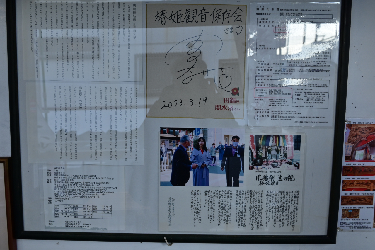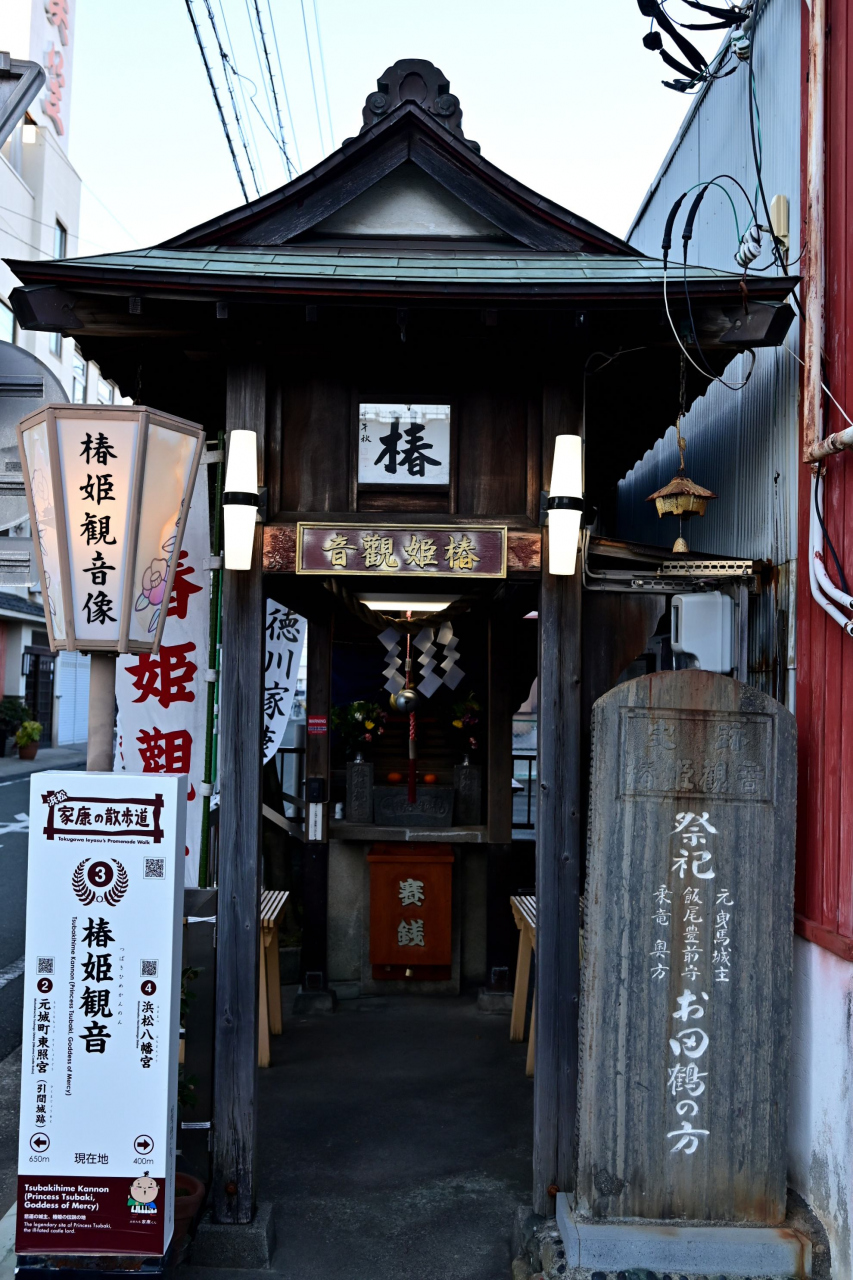 引間城主の飯尾連龍の妻であるお田鶴の方を祭るお堂だ。夫が今川氏真に殺害された後、自らが城主となり、攻めてきた家康と闘い、壮烈な最期を遂げた。お田鶴の方は家康の正室である築山御前と縁戚関係にあり、その死をいたんだ築山御前が墓所に椿の木を多数植えたことから椿姫の名が付いたという。後年、女武者、烈婦として武勇、節操の高さをたたえられ、いつしか観音様として信仰の対象となった。このエピソードはNHK大河ドラマ『どうする家康』でも紹介され、演じた女優が現地を訪れた記事などが飾られていた。ほこらが小さいのは徳川家の目をはばかったのかもしれない。