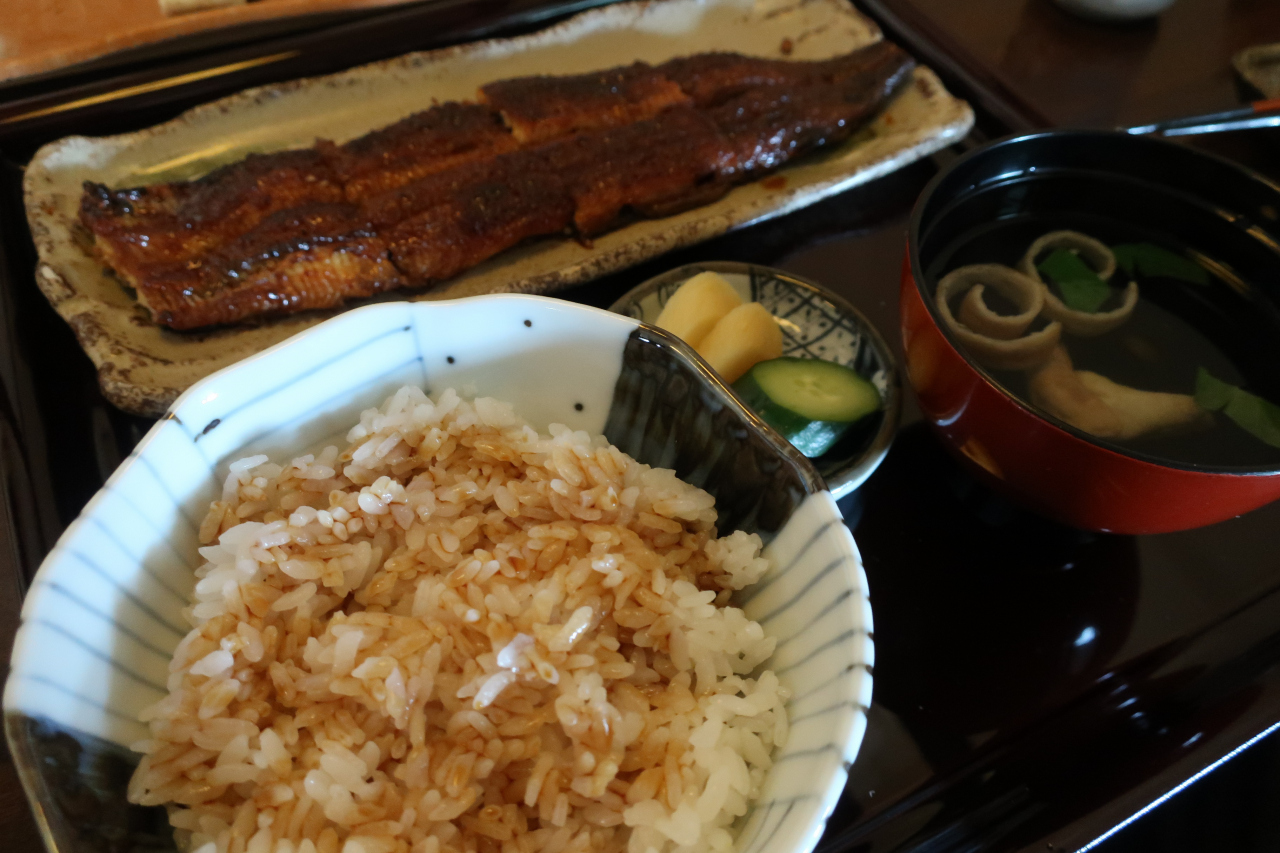JR浜松駅から15分ほどバスに乗った郊外にある。午前11時の開店時に予約して入った。店内はテーブル席と座敷席に分かれ、2階もある。炭焼きのにおいが店内に充満しており、最高の舞台装置だ。オーダーは奥さん共々「長焼きごはん」。かば焼き、ごはん、肝吸いというよくある組み合わせだが、何といってもかば焼きが素晴らしい。大き目のウナギが皿に長々と横たわっているのだ。関西風でパリッとした仕上がり。身のふくよかさと皮の食感のよさを楽しみながら、あっという間に平らげてしまった。さらに白焼きも単品として頼んだ。平日だったが、開店時から続々と客が訪れ、帰途につくときは待ち人が駐車場に滞留していた。「ウナギどころ」という言葉があるかどうかは知らないが、さすが「ウナギどころ」の浜松だ。どれほどウナギを食べてきたのかと問われれば自信はないが、これほどおいしくて、コスパの高い店はなかなかない。