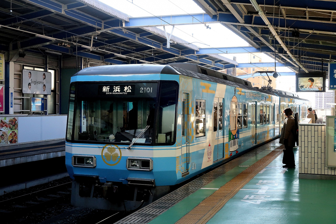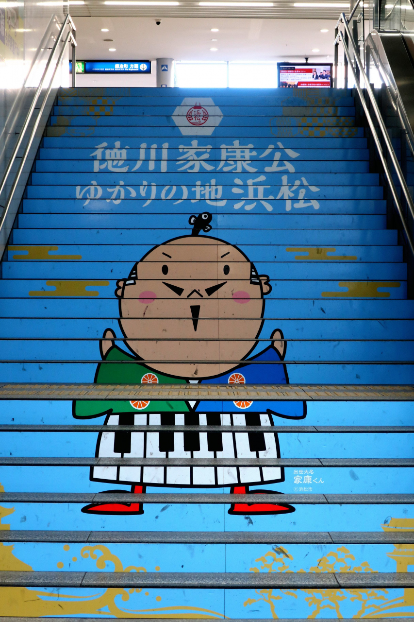 この日は遠州鉄道で天竜二俣駅に向かうために新浜松駅へ。遠鉄百貨店の近くにある便利な駅だ。駅舎の階段には浜松市マスコットキャラクターの「出世大名家康くん」が描かれており、撮影ポイントだ。始発駅らしく、撮影ポイントがいっぱいだ。この日は「家康くんラッピング電車」に乗車することができた。