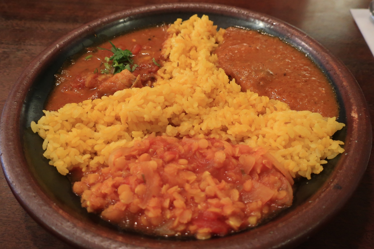 岡山の中心アーケード商店街から一本入ったオランダ通りにあるオールカウンター席のこじんまりとしたカレー店。小麦粉を使わず、スパイス中心で調理したルーが特徴だ。この日は夫婦そろってフィッシュ・ダル(豆)・チキン三種盛りをオーダーした。辛さは数字で注文するが、当方は3辛、辛さは苦手な奥さんは辛さはそのままをオーダーした。辛さは3辛でまずまずだが、オーダーを聞いているととんでもない数字を頼んでいる人も。詳しくはないが、インド南部ベンガル地方の家庭料理がベースだという。次回は野菜カレーやゆで卵のトッピングもつけたい。