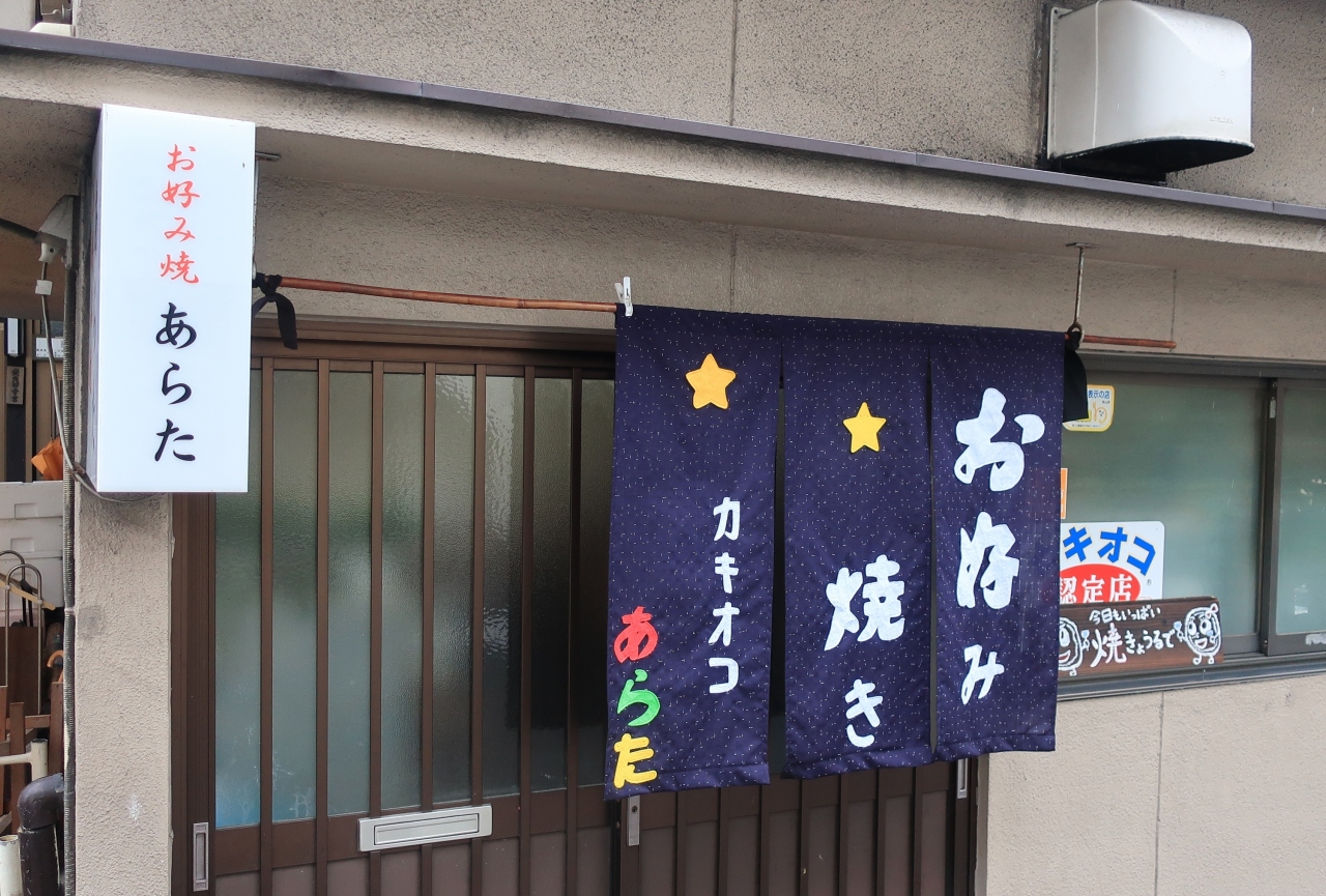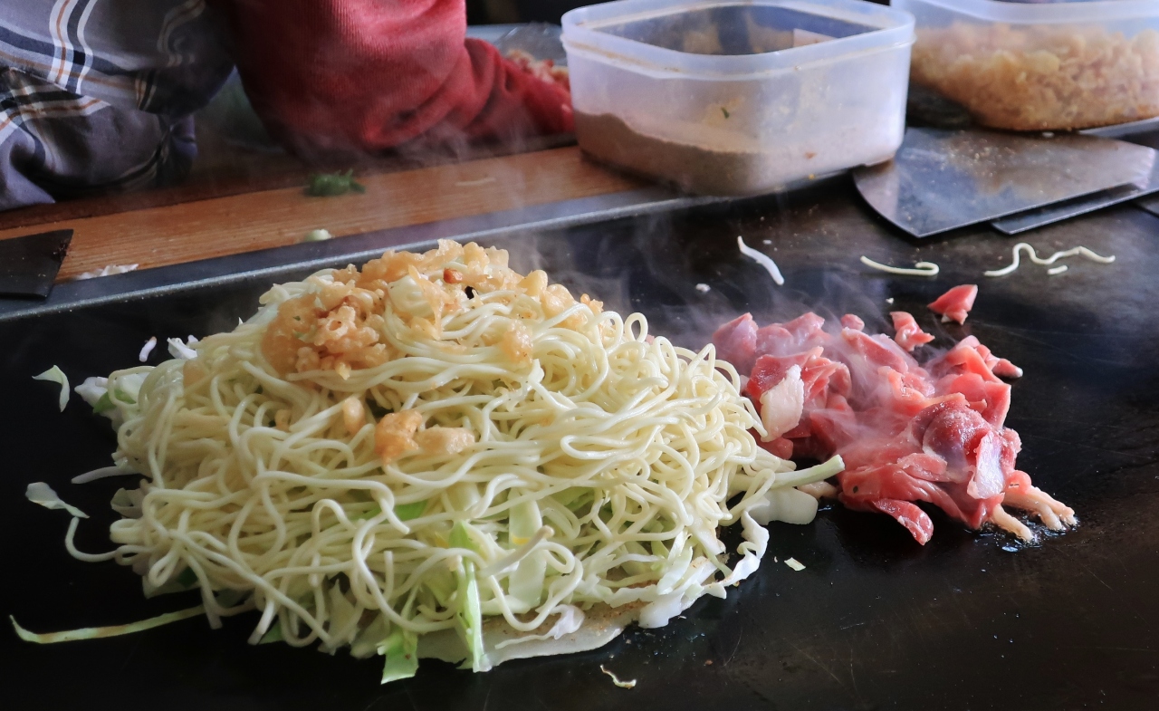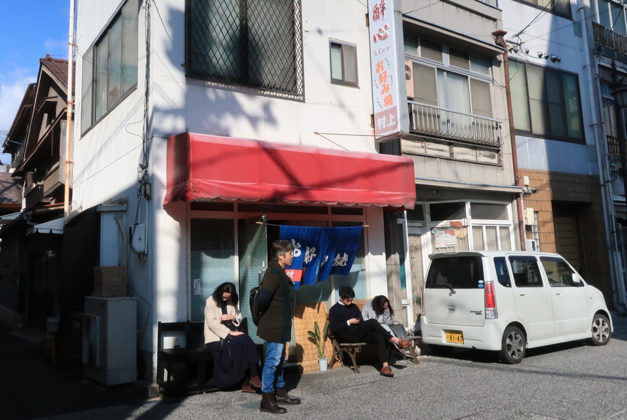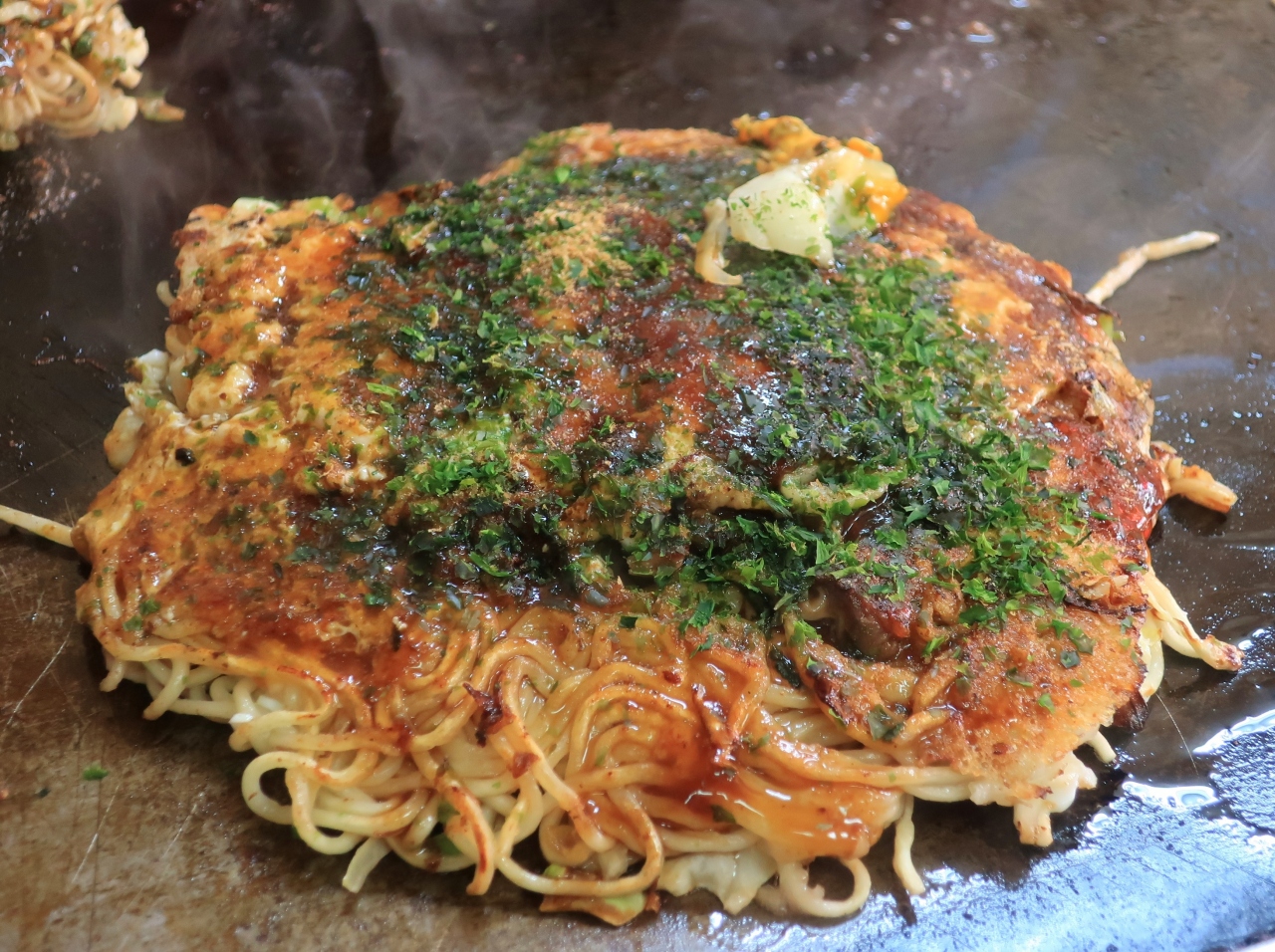 広島風お好み焼きに鶏のズリを入れる尾道焼の有名店だ。商店街の西端にあり、午前11時半の開店で11時に到着。一番乗りだったが、開店直後の11時半にはすでに入店待ちの列ができていた。店内と雰囲気は「昭和」そのものだ。姉妹というおばあちゃん二人が客の注文をユーモラスにこなしながら焼き上げていく。注文を覚えられないなど危なっかしいのだが、〝秘書役〟の女性が一手先、二手先までフォローしてオーダーをこなしている。その光景が面白いのだ。大丈夫かな、と思いつつ、少しのミスは見ないふりをしながら完成を待つ。時々茶々を入れる常連客があるが、適当にあしらって客の笑いを誘いながら料理を続ける。店内は狭く、鉄板を取り囲む6席しかない。がつがつと客を入れるのではなく、焼く時間も食事のうちという雰囲気がいい。この日は奥さんと二人で全部が入った尾道焼きとズリ玉をオーダー。焼きそばかうどんをクレープ状の小麦粉ではさんで食べる広島風で、ソースを継ぎ足しつつ、独特の食感を楽しんだ。