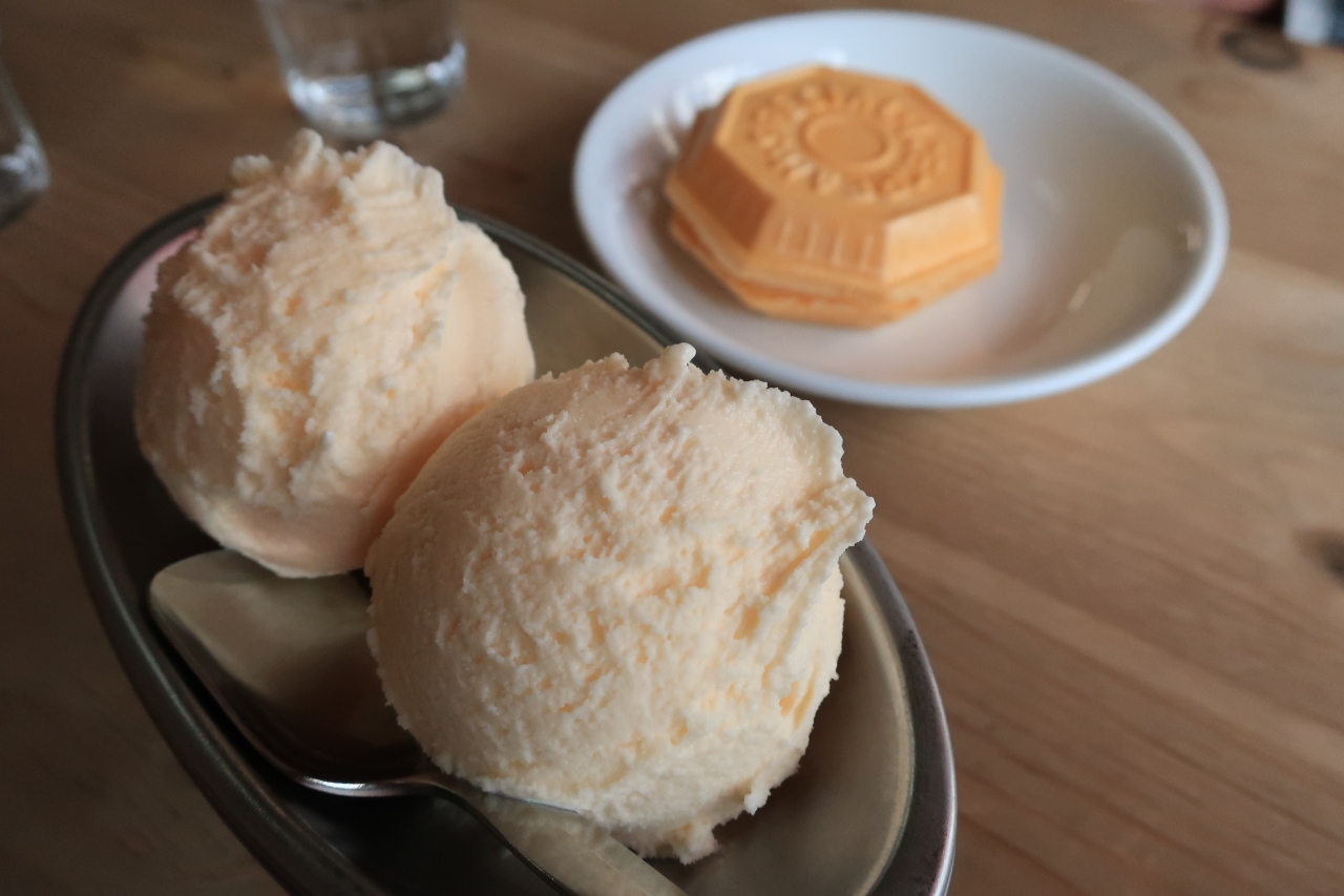 ここのアイスクリームは市内各地で売っているが、あえて本店のイートインで食した。持ち帰りメニューに「モナカの皮5個分」とあるが、これがこの店の特徴をよく示している。皮がパリパリで、とにかく食感がいいのだ。その皮に包まれているのが、この店特製の「たまごあいす」。本店ではたまごあいすと皮に包まれた「アイスモナカ」のほか、ぜんざいや抹茶などの〝変化球〟も楽しめる。毎日食べなくともいいが、尾道を訪ねる機会があれば必ず食べたいような味だ。
