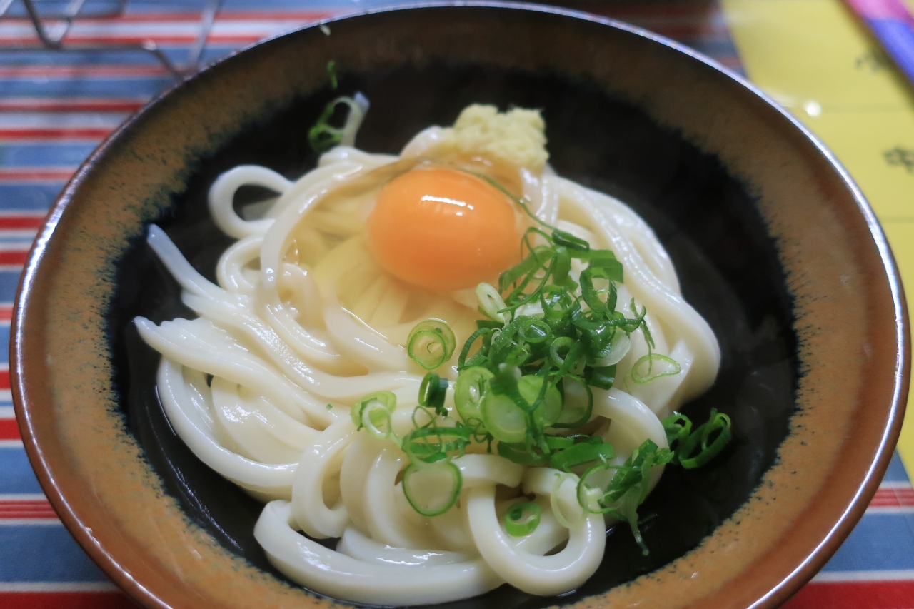 営業時間が午前6時から9時までという製麺所系うどん店だ。麺は太く、コシが命の男麺だ。かけ、醤油、釜玉、納豆の4コースある。この日は奥さんと2人で釜玉と温かいかけをオーダー。期待通りの麺のコシを楽しむことができた。繊細さはないが、プロが打つ麺そのものだ。店舗は田園地帯の集落の一角にあり、もともとは地域の食料品店ではなかったか。だんだん品数が減り、うどん店としてテーブルといすを置いていった感じだ。おばちゃんが「製麺所系」らしくて、味わい深い。