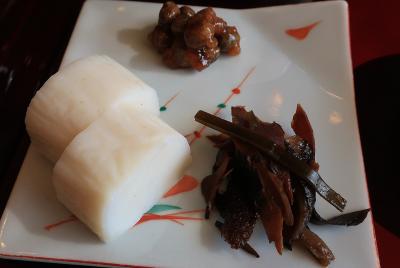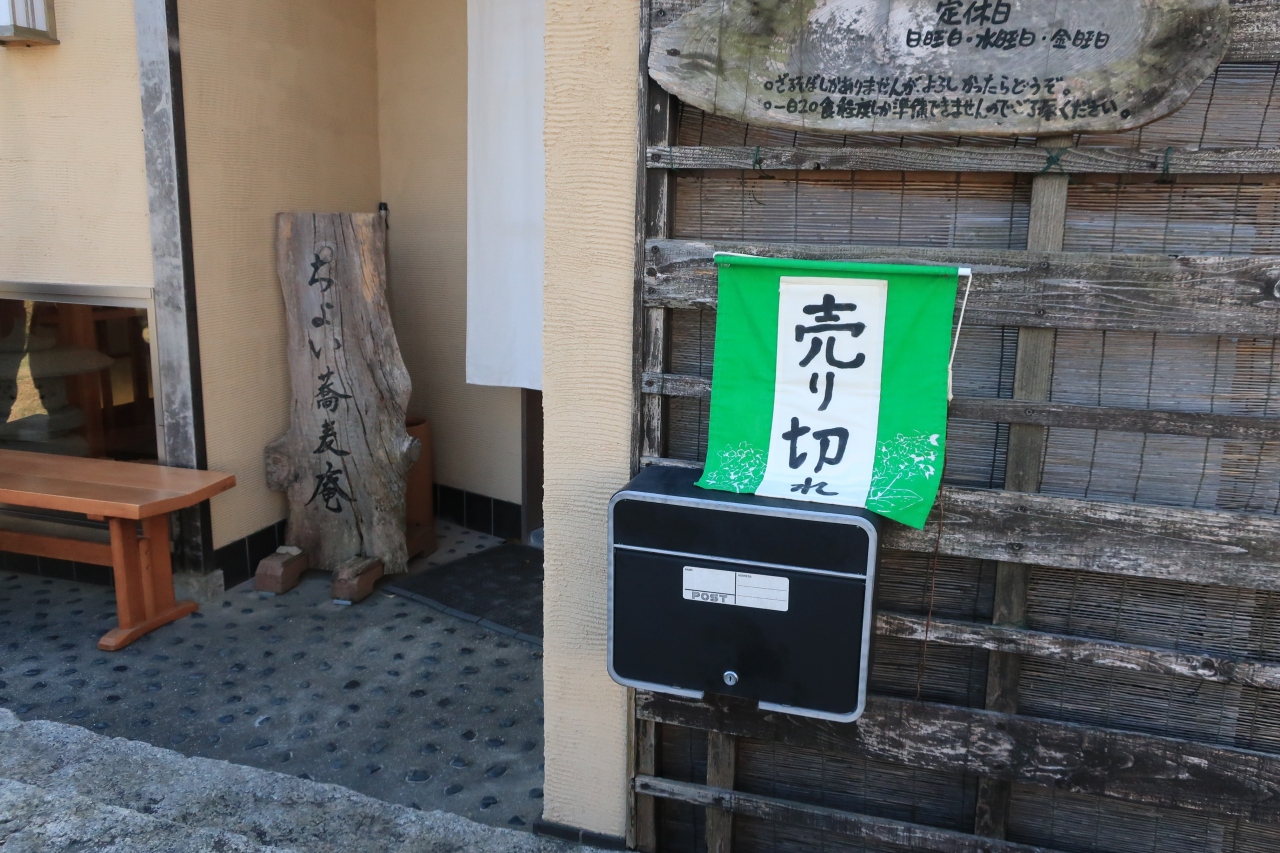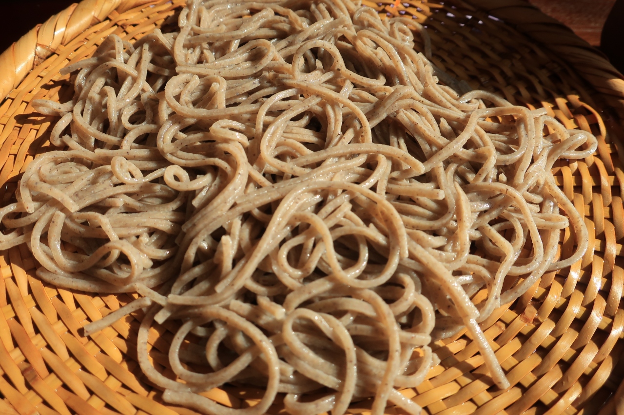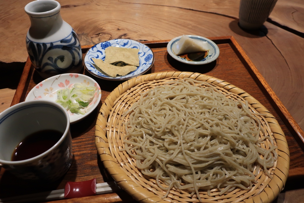 蒜山の町から少し離れたのどかな場所にあるが、有名店だ。この日は開店と同時に入ったが、すでに数組が。そばは「すべて十割」だといい、メニューはざるそば(並、大盛り)と温かいそばの二種類だ。この日は奥さんと二人で丸抜きと田舎そばの「ざる」をオーダー。個人的には丸抜きの風味が高く、良質だと感じた。この次は二人とも丸抜きを注文するかもしれない。店舗は山小屋風で、座った席のテーブルも木の根を利用したダイナミックなもの。自家製粉で、店内にはそば粉も売っていた。自信があるのだろう。