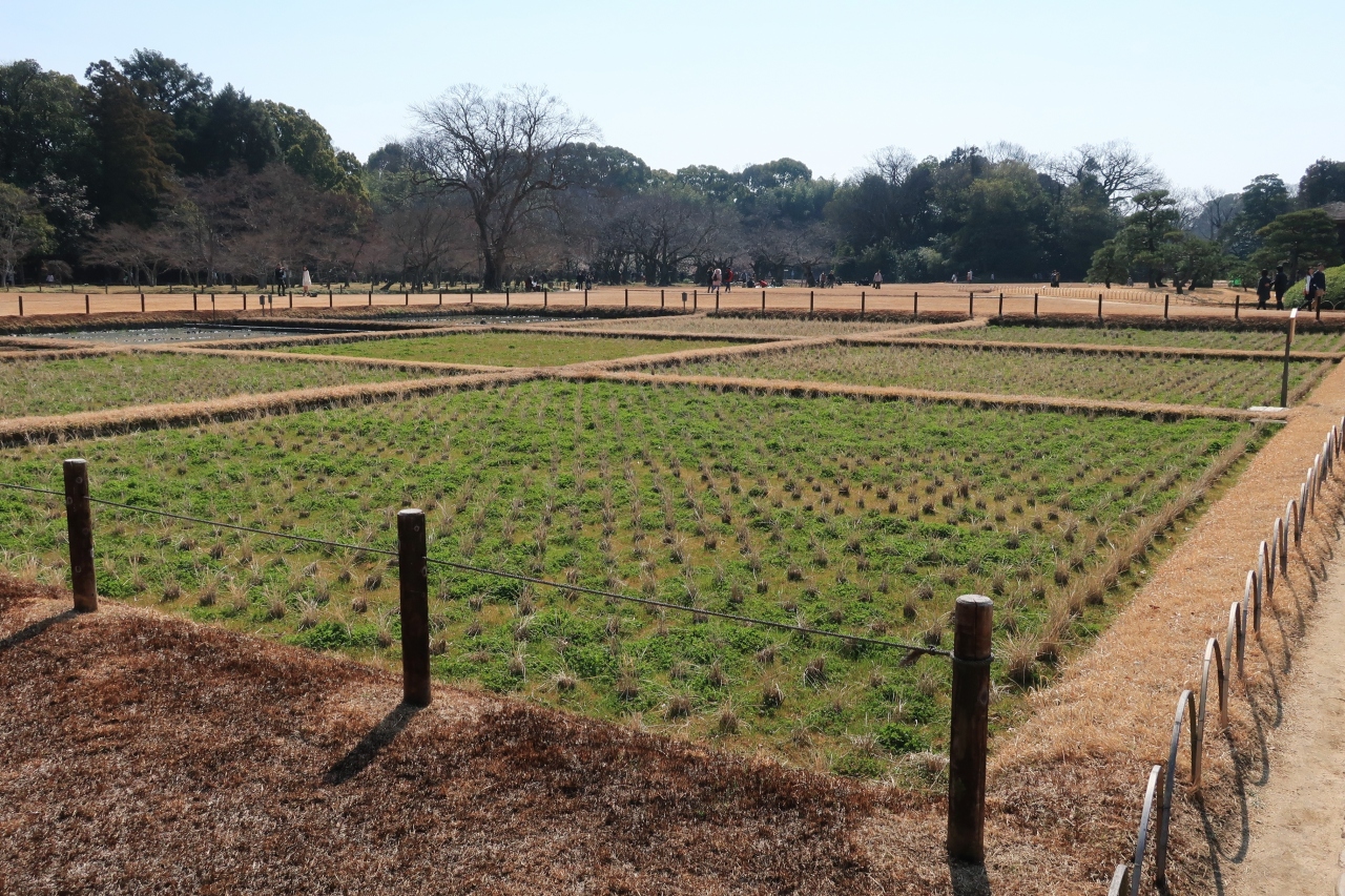 後楽園の中にある田んぼだが、これが由緒正しい。古代中国の周王朝の租税法である「井田制度」を再現したものだという。ほぼ正方形の土地を9等分し、一つの区画を「公田」として共同作業場などを開設。残る八つの田んぼを「私田」として8軒の農家に作らせる。8軒の農家は収穫物の1割を税として納めたという。上から見ると「井」の字に畔が敷設されているので、この名がついたのだろう。説明を受けると「おお」という感じだが、知らないと何気に通り過ぎてしまう場所だ。