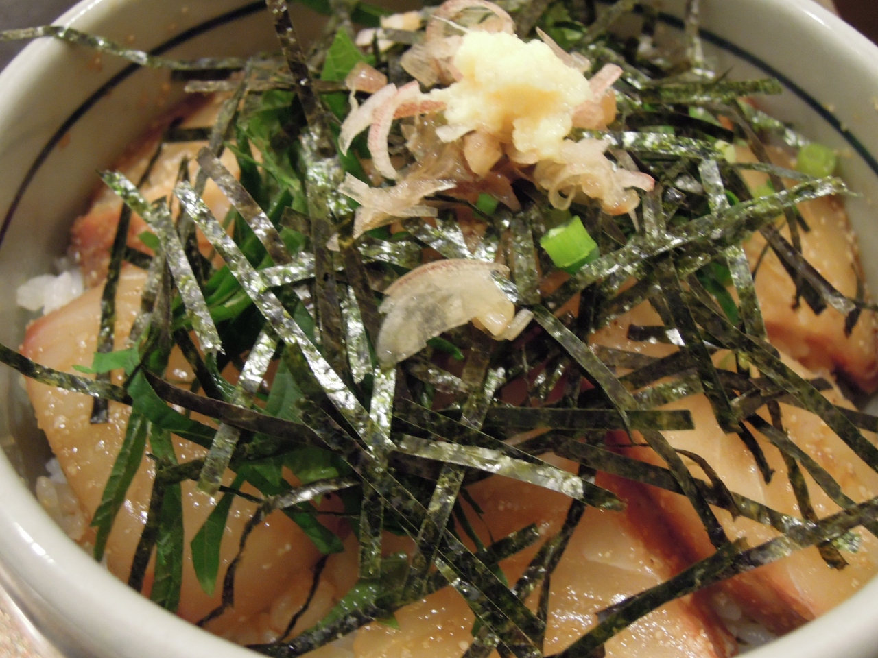 後日、今度はランチタイムにのれんをくぐった。にぎりが並、上、特上とあるほか、刺身定食、天ぷら定食などコストパフォーマンスが高い献立が並ぶ。が、この日のお目当ては1500円の「わら丼」だ。わらどんと読む「わら丼」は、同店の登録商標。いわばサワラの漬けをのせた丼といったところか。特筆すべきはタレだ。タレがしみ込むようにサワラにしては薄く切られた身がご飯の上に敷き詰められ、丼の楽しみを引き立てている。タレのかかったごはんのおいしさは説明不要だろう。