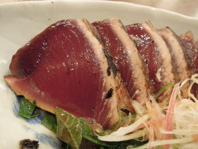 高知市ではひろめ市場などに複数店を構える人気店舗だ。といいながら高知の店に行ったことはなく、岡山に出店してから初めて入った。室内装飾は一本釣り漁船をモチーフにしているのだろうか。中央のカウンターを囲むようにテーブル席が多い。やはりイオン出店とあって、居酒屋ではなくレストランテイストに振っているようなデザインだ。入り口脇にはガラス越しにわら焼きでたたきの実演が見られるアトラクション設備も。この日は午後5時からの夜の部に入店し、タレと塩のカツオのたたきが同時に楽しめる「これやきセット」や土佐巻き、なめろう、サラダなどをオーダーした。高知県外にいると冷たいたたきを食べることがほとんどだが、高知のたたきは氷水で締めても温かみが残っている。そのテイストが気軽に味わえるのは、いい。
