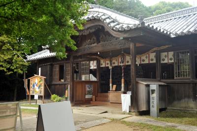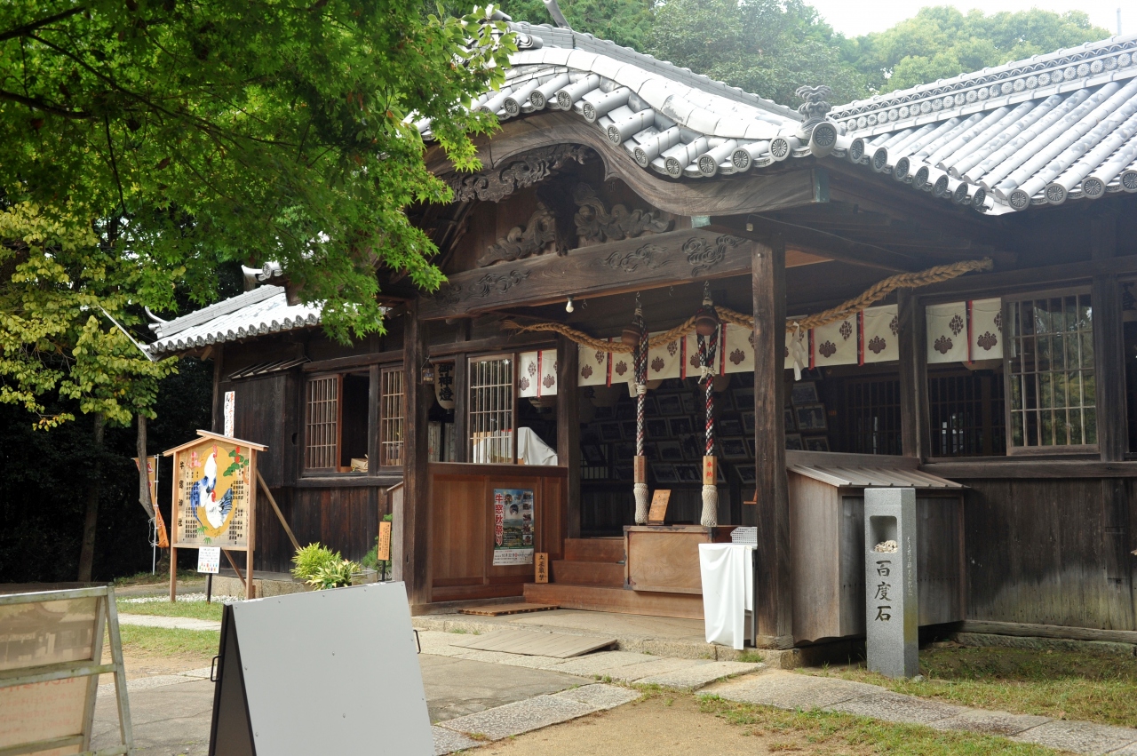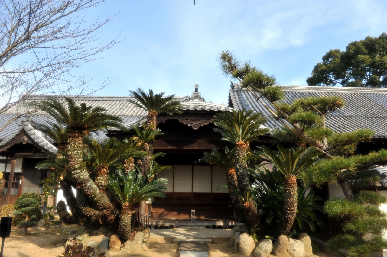 神社仏閣の門前というと普通はモミの木やクスノキがあるものだが、ここは門前にシュロの木があり南国を思わせる。小高い丘にあり、三重塔はまちのシンボルのようだ。江戸時代の道幅が残るというしおまち唐琴通りに面したところにあり、山門を上がると客殿が目に飛び込んでくるが、本殿や三重塔はさらなる高台にある二段構えのお寺だ。本殿は端正な建物で、境内は狭いが、本殿、三重塔のバランスはとても整っており、古くは朝鮮通信使の宿舎にあてられた歴史がある。施設の見学は要予約で、この時は見ることができなかった。