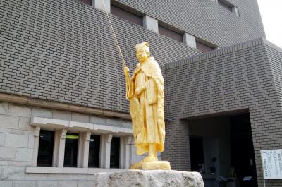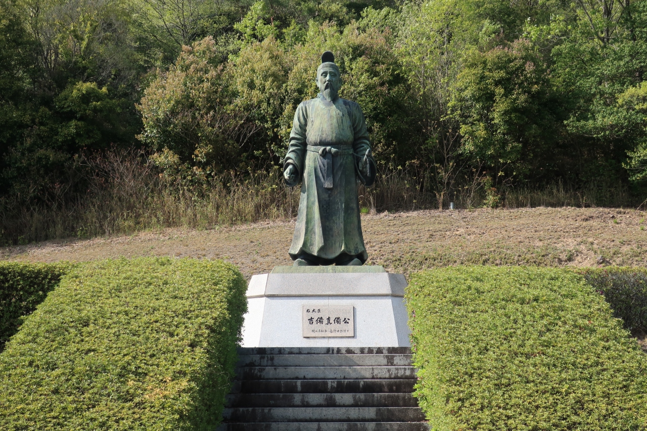 英雄の生誕地や終焉の地は観光地になる。それがゆえに、違う場所で正統を競う論争が起きるものだ。近隣では美作と播磨で対立する宮本武蔵の生誕地がそうかもしれない。ここも論争が起きているとはいわないが、吉備真備といえば倉敷市真備町のはず、と疑問を覚えて入園した。地元ではこの地が吉備真備あるいはゆかりの豪族の屋敷跡に比定されているらしい。まあ、古代は真備町だ、矢掛町だと境があったわけではないのだろう。入唐して1250年を記念して造られたそうだが、6・5メートルもあるという像はなかなかの迫力だ。隣接する古代の丘と呼ばれるオブジェは、ちょっと説明が難しい。