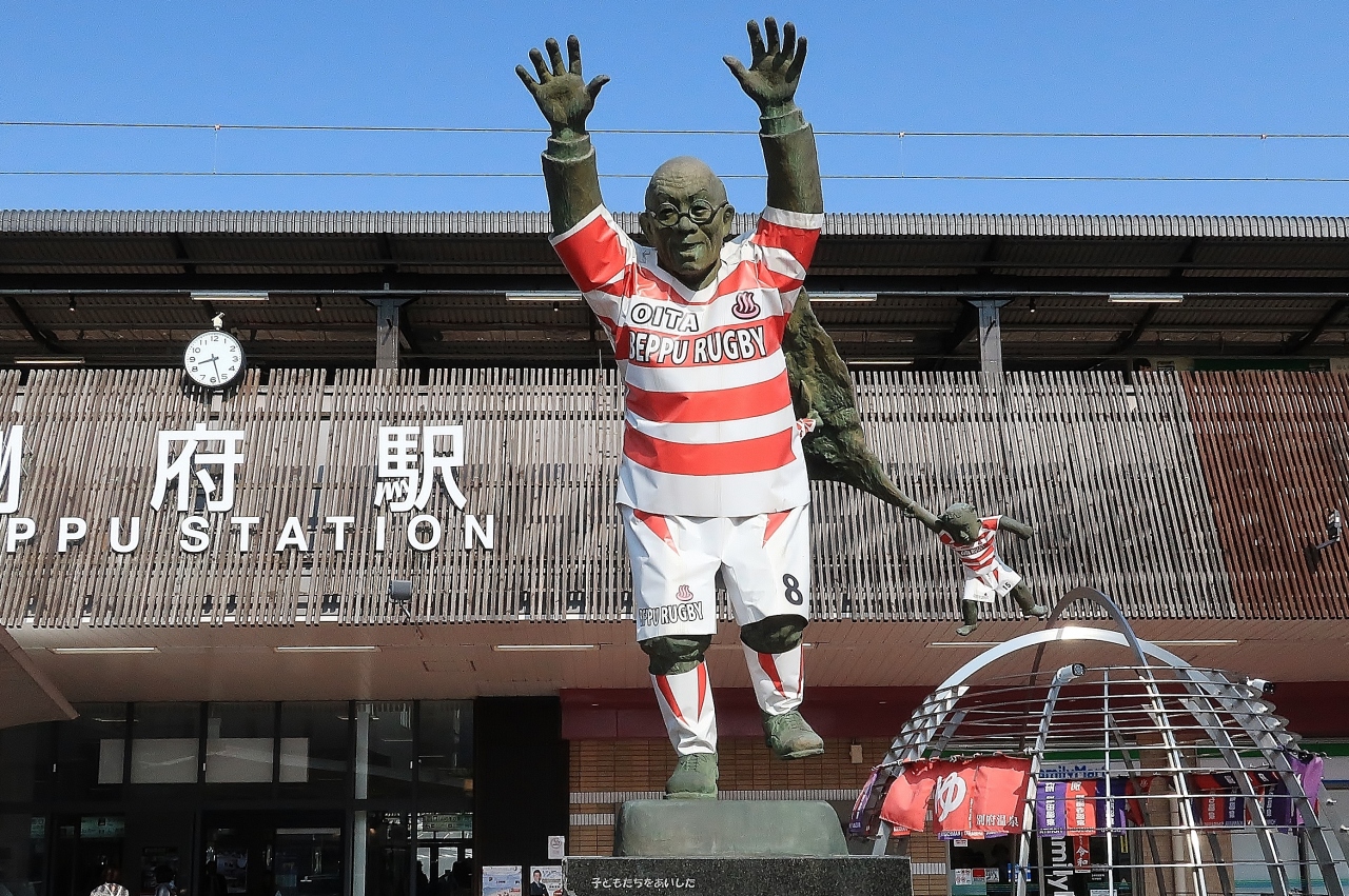 駅前の銅像はそのまちのヒーローが建立されるものだ。岐阜駅の織田信長、甲府駅の武田信玄、赤穂駅には大石内蔵助、お隣の大分駅には大友宗麟とフランシスコ・ザビエルが威風堂々と立っていた。一風、変わったところでは津山駅は箕作阮甫という蘭学者だったが、若い日の旅立ちの姿だった。普通はそうなのだが、油屋熊八の像のようなポーズは見たことがない。芸術家は自由な像を造りたがるものだが、発注者がよく許したものだと思う。と、いうか、地域がよく認めたと思う。よっぽど、こうしたポーズをとっても違和感のない人物でなければ、この格好で駅前の一等地に鎮座できまい。この人の生涯は有名なので、ここでは省く。行った時はラグビーのW杯PRのため、ラガーシャツを着ていた。らしいといえば、らしい。