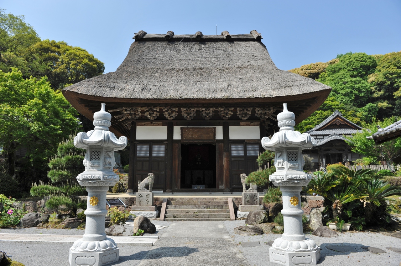 六郷満山の第23番札所。六郷満山を含む国東半島の寺院は天台宗が多いが、ここは珍しく曹洞宗だ。江戸時代は九州の曹洞宗総本山だったという。風格がある石段の先には二重門の山門がそびえ、石仏の仁王像がある。正面の仏殿は室町時代の建築で、かやぶきの大きな屋根が珍しい。仏殿と開山堂は国の重要文化財だ。ご朱印をいただく間に本堂などを見学させてもらったが、壇上の本堂と寺務所が渡り廊下でつながっているなど、かなり大ぶりな構え。九州の曹洞宗総本山だった片鱗がよくわかった。