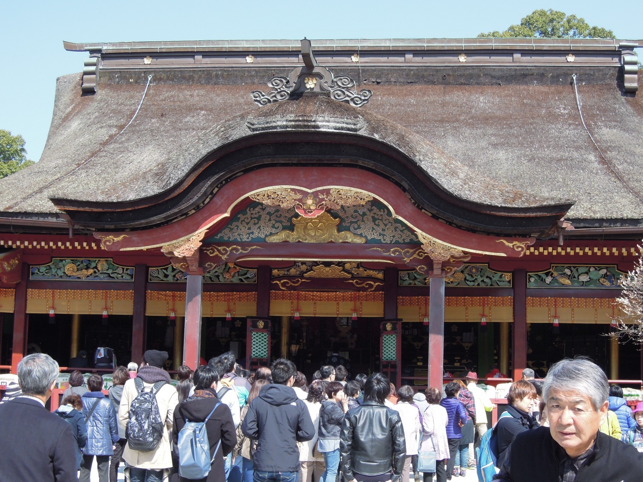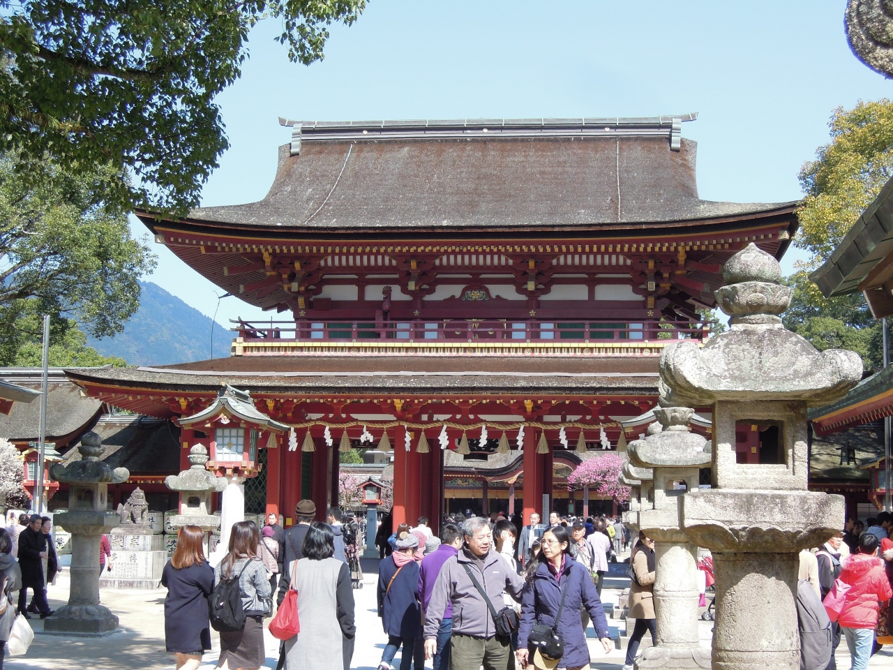 境内の中ごろにある国指定の重要文化財だ。社殿は長禄二(1458)年の建築とされ、意外だが九州では最も古い木造建築だという。釘を一本も使っていない組木細工でできており、優れた工芸品だと高く評価されている。見落としがちだが、順路上なので一見を。