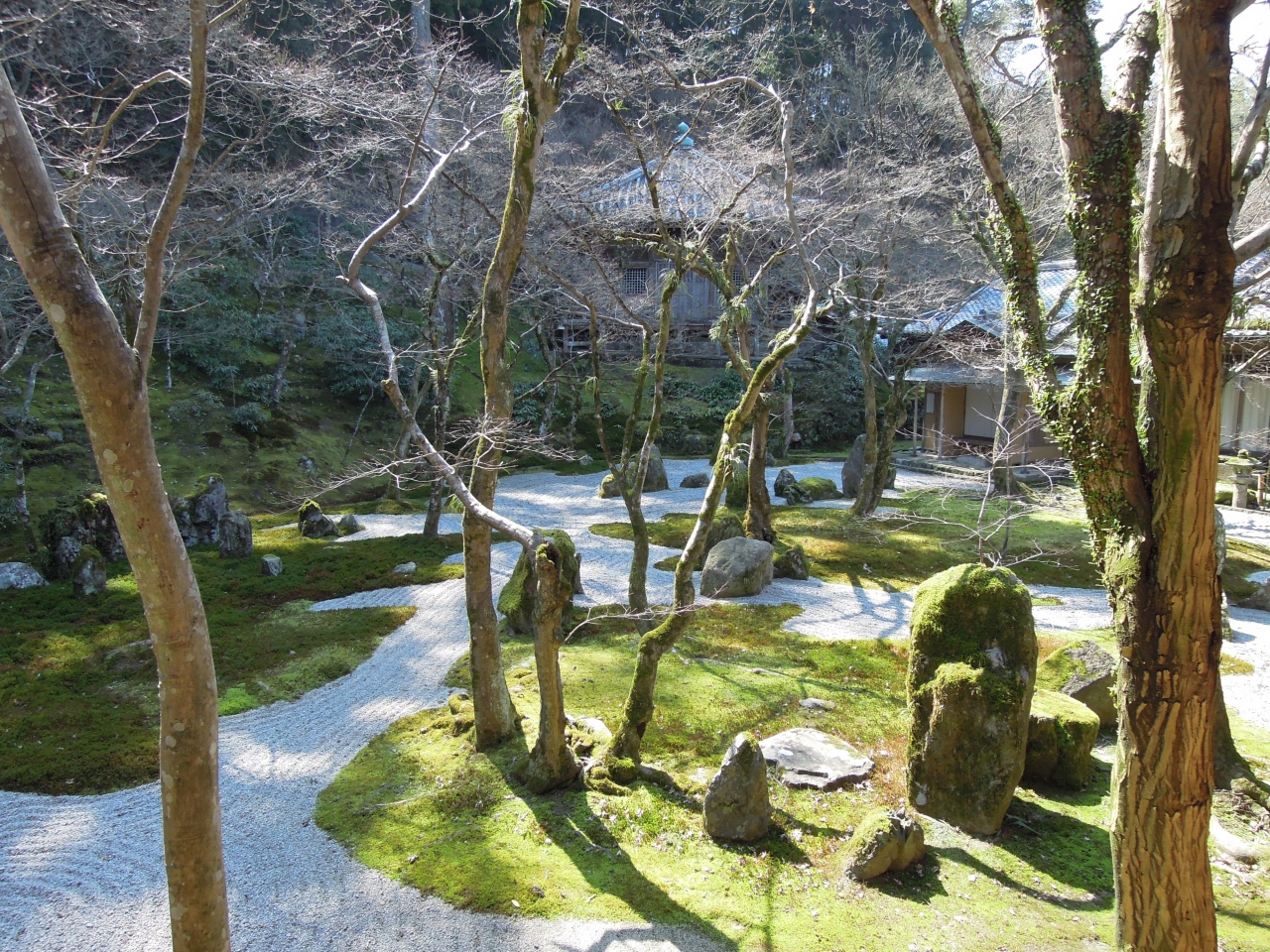 光明とはよく名づけたもので、光がきれいに見える庭園だった。西鉄太宰府駅裏手の国博通りをしばらく歩くと右手に見えてくる寺院。門構えは小ぶりだが、意外と庭が開けている。地元では苔寺と呼ばれているらしい。入り口は無人だが入場料として200円を納める。門をくぐると左手に見えるのが「仏光石庭」。京都の竜安寺を連想させるような石庭で、庭石が「光」の字に配置されているそうだ。裏庭が「一滴海の庭」。樹木と白砂と石の配置の妙が見るものを魅了する展観で、白砂の上に描かれた箒目と苔むした木々に反射して緑に見える光が印象的だ。紅葉の時季の写真があったが、再訪したくなるほど十分な説得力があった。