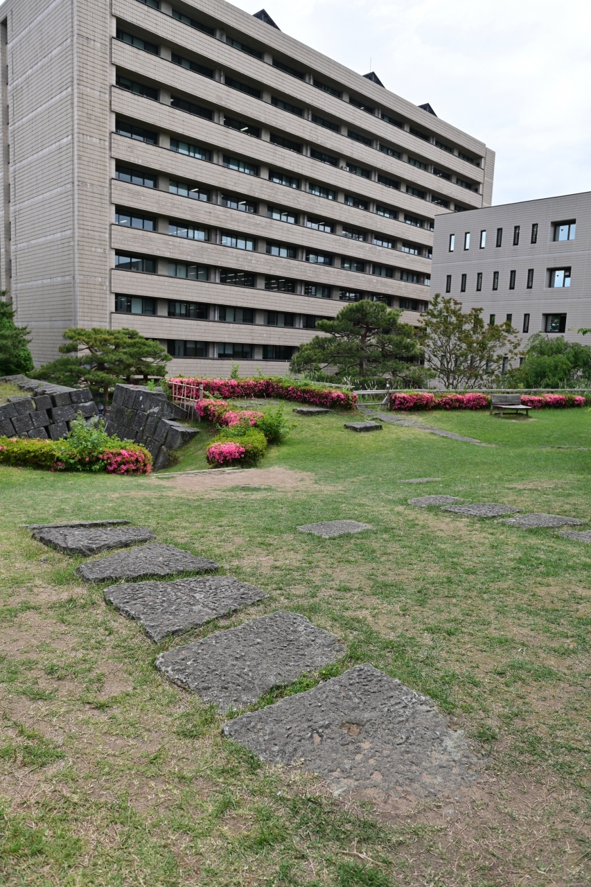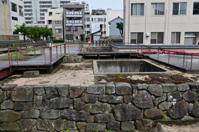 戦国武将の〝超有名人〟である柴田勝家が築いた北の庄城。その城跡にある遺跡公園が柴田公園だ。北の庄城は結城秀康が入府した後に破却され、実像がつかめていなかった。この一帯は考古学的調査で城の存在が確認されたという。現在は遺跡公園として石垣跡などが保全されているほか、勝家が半石半木で足羽川に架橋した九十九橋が再生されている。戦国時代末期の城だが、思ったよりも平たい場所にある。