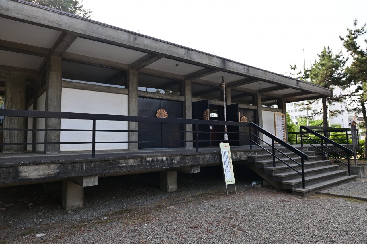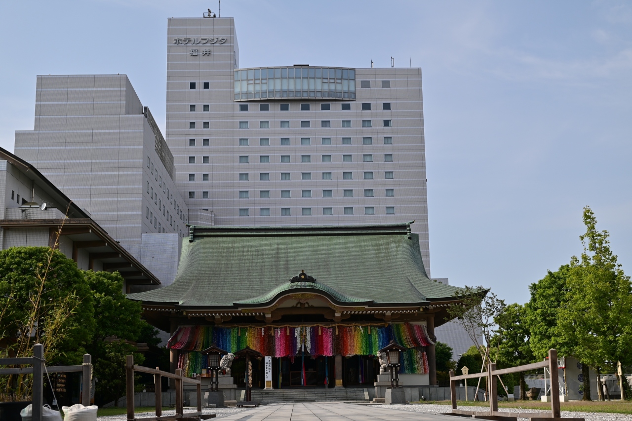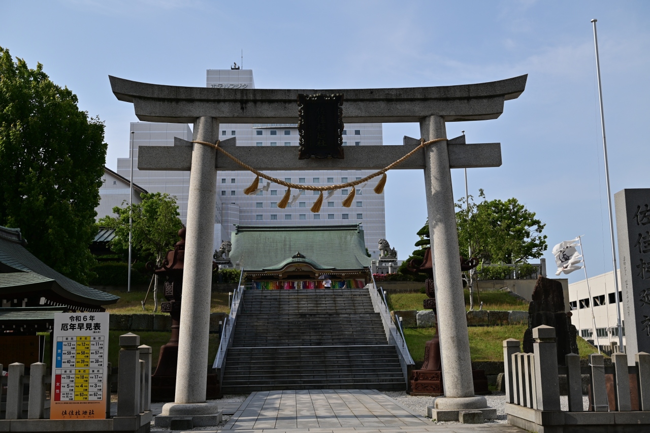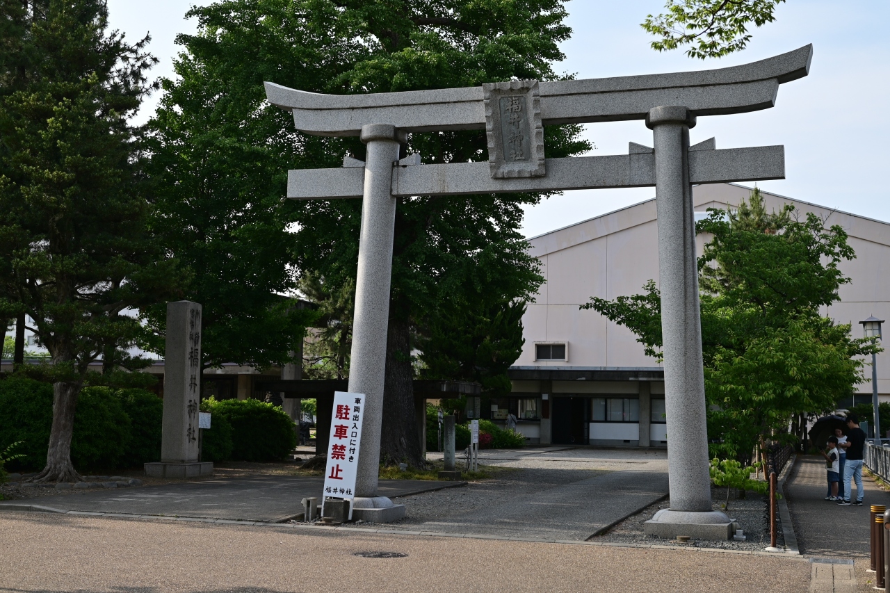 福井県庁近くの福井市のまん中にある神社。最初に徳川家康を祭り、その後、家康の次男で藩祖の松平(結城)秀康を合祀。明治時代に入り、幕末から明治に活躍した松平春嶽を祭った。紆余曲折を経て平成に建て替えを選択したが、全国でも珍しい神社を含む再開発で整備された。訪れた時に驚いたが、神社と背後のホテルが通路で結ばれ、結婚式と披露宴、さらにはブライダル関係のショップが一つのビルの中に一体的に組み込まれていた。本殿自体は新しいが、御朱印や授受品が豊富で、福井に来たならば参拝しておきたい神社だ。