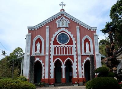 平戸の教会を訪ねるのに道路事情をうんぬん訴える気はない。それがこの土地柄だからだ。が、ここは大変だ。幹線道路から脇道にそれて教会に向かうのだが、途中、絶対にすれ違えない道が細々と続く。かろうじてすれ違いゾーンが設けてあるのだが、よっぽど深慮遠謀が必要だ。教会は農村地帯の素朴さが漂う。正面に掲げられた天主堂という漢字がなかなかレトロ。建物横のテラスが特徴だ。