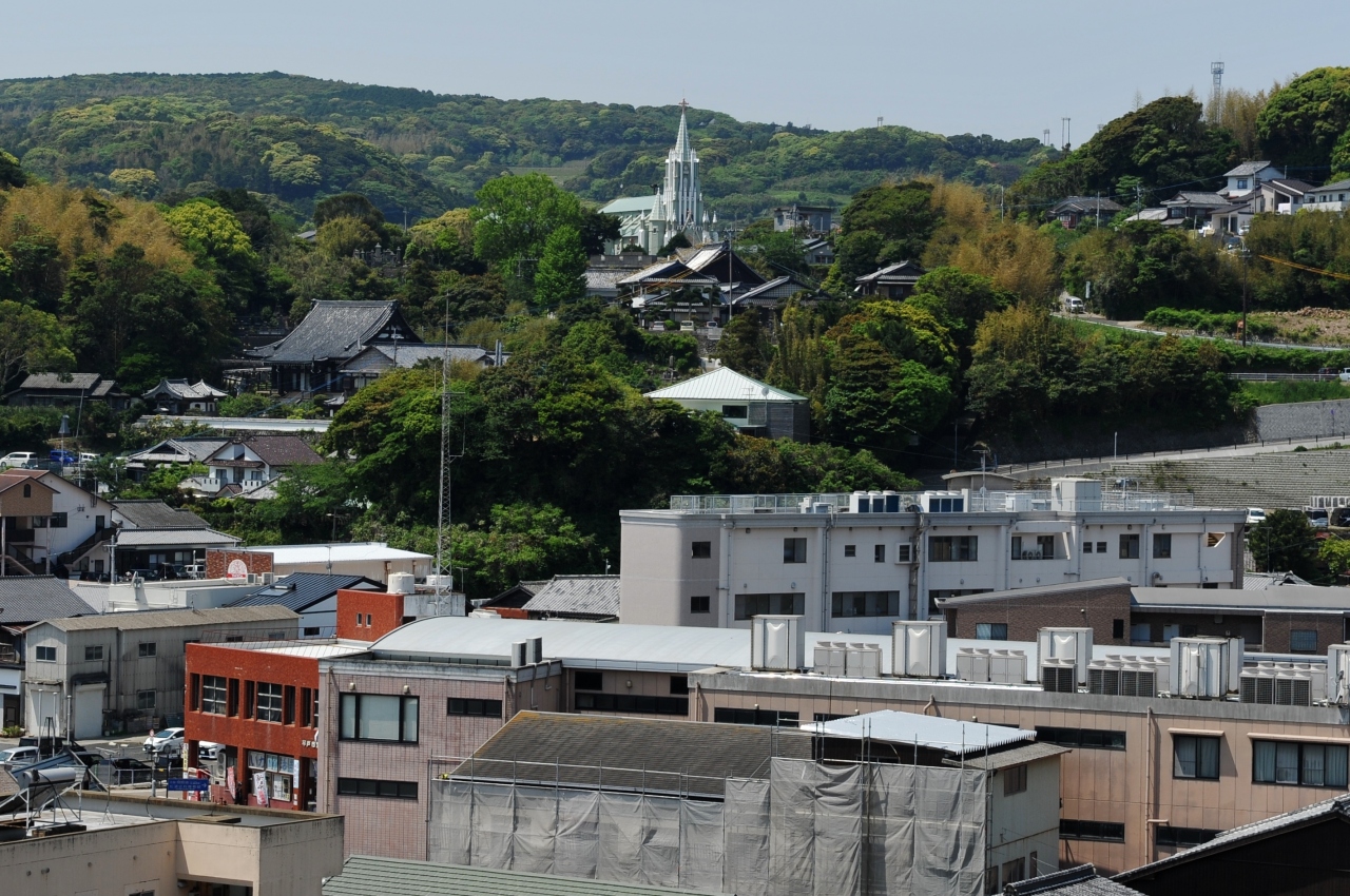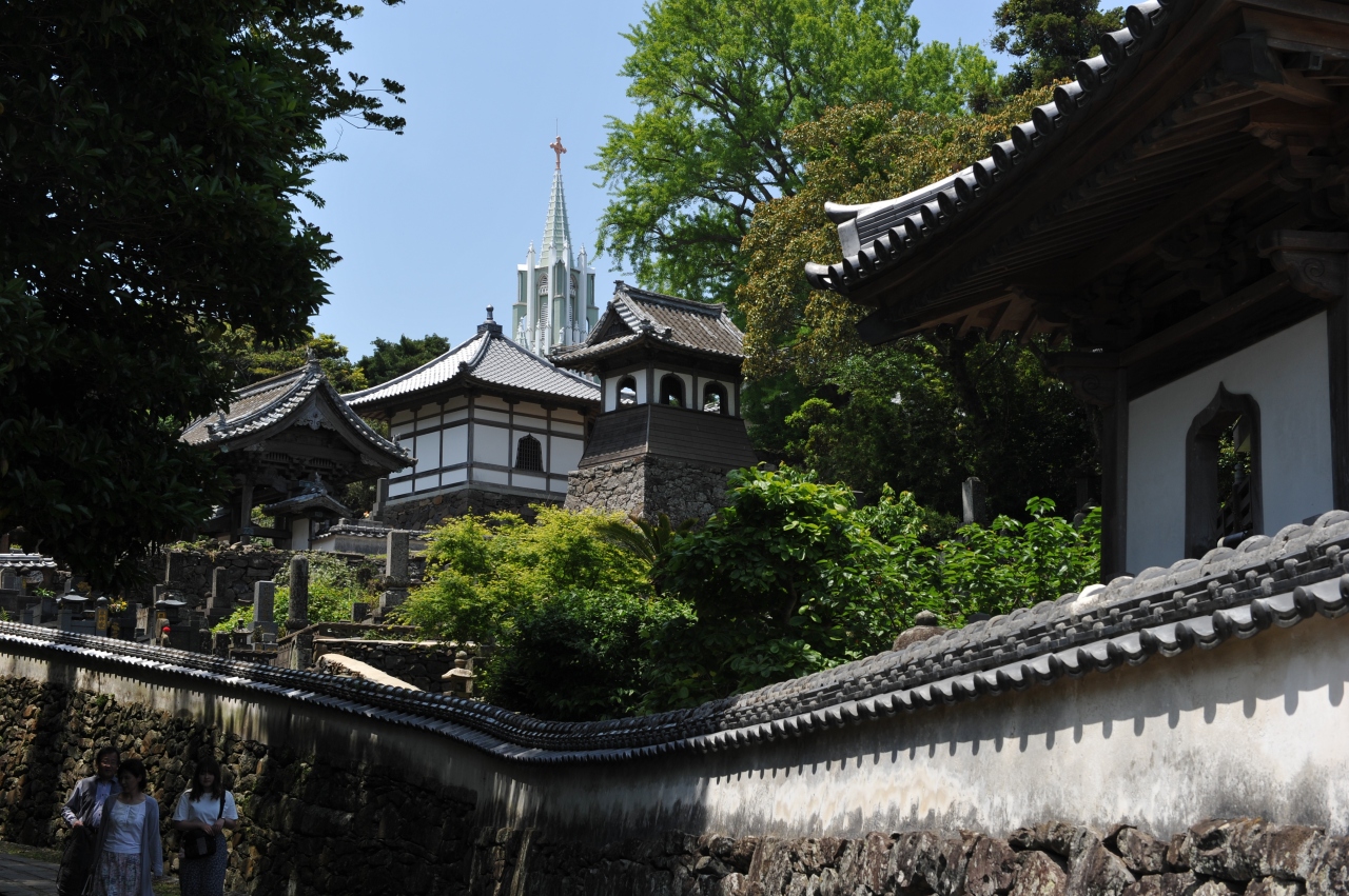 あまりに有名な、平戸ザビエル記念教会と三つの寺院が降りなす景色だ。この日は市役所付近に車を置いて整備された石畳を歩いて上がった。現地に行ってわかったのだが「寺院と教会の見える風景」は一カ所のピンポイントではなく、いろいろな切り抜き方が可能な風景だった。個人の思いを反映した「寺院と教会の見える風景」が撮影できると思う。教会の建立は1931年なので、この風景が注目されだしたのはそれ以降だ。あまり哲学的に語ってはならないのかもしれないが、洋の東西、仏教とキリスト教、本邦と異国などいろんなものが交錯した風景のようだ。