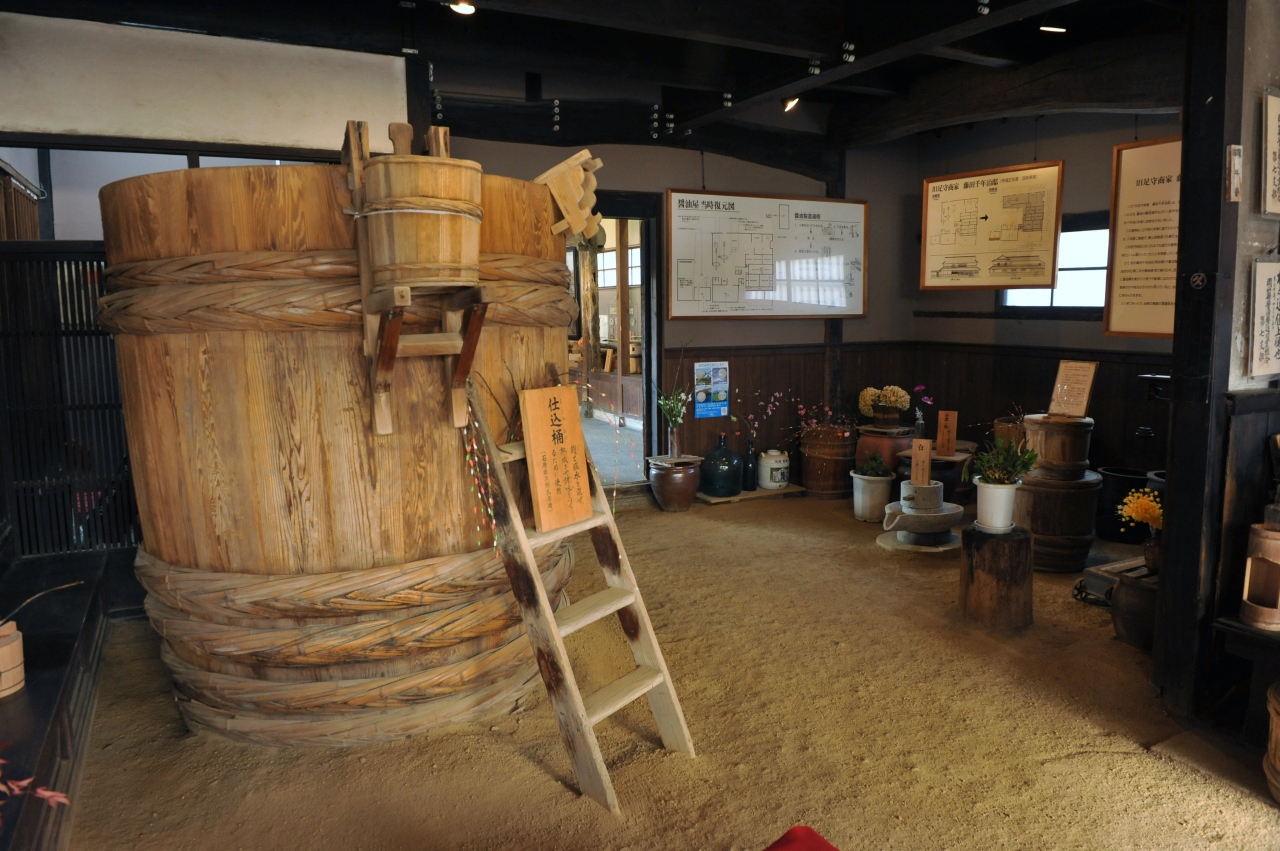 足守の町並みの中ほどにある資料館だ。廃絶していた醤油醸造場を復元し、往時の商家の姿を紹介している。建物は通りの一角を占めるほど巨大で、中に入ると帳場やしょうゆ桶、醤油の生産工場などの展示がある。おそらくは地元ボランティアであろう解説員が常駐しており、親切に案内してくれた。藤田千年治は創業者の名前だが、代々の当主が襲名していたという。ここも入館無料だ。