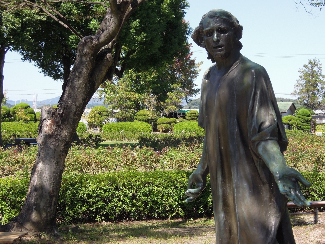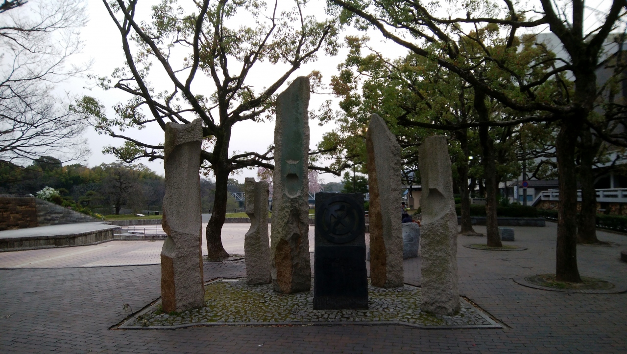 JR岡山駅を起点とする桃太郎大通り。これを旭川まで真っ直ぐ行くと、突き当たるのが石山公園だ。ここを扇の要とすると旭川、後楽園、県立美術館、岡山城、県立図書館、市民会館と文化ゾーンが並ぶ。市民会館は移転が決まっているので、数年後には新しい名前が加わると思うが。イベントが多いのもこの公園の特徴だ。期間限定のオープンカフェ、パンなどのマルシェ、市場など四季折々に開催されている。モニュメントも多い。噴水と一体化した平和の像、岡山城築城時の巨岩運搬を再現したイベントで運ばれた岩の展示、現代アートの文化の十字路などだ。また、入り口のモニュメントは倉敷市の楯築遺跡のようだ。この公園の所で旭川は大きく曲がっており、朝方は岡山城と朝日の共演を観賞できる。