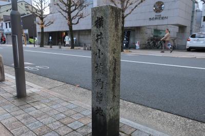 京都御所に近いこの地は要衝であり、大物がこの地に拠点を構えた。最初は室町幕府きっての名門として知られた斯波氏の邸宅があった。後年、13代将軍の義輝はここに屋敷を構え、政務を執った。さらに、織田信長は15代将軍の義昭のために二条城を建設した。現地の石碑は場所を見る目の慧眼が時代を超えて受け継がれたことを示すようだ。