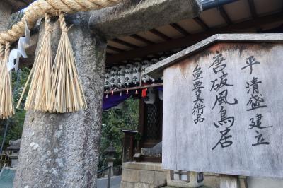 京都御苑にある神社。平清盛が母の祇園女御のために勧請し、後年、祇園女御も合祀された。厳島神社はいわゆる宗像三女神を祭神とするが、その中でも市杵嶋姫命は弁財天と習合する例が多く、ここでも弁天さんが祭られている。この神社は公家の九条家邸宅に取り込まれており、庭園の池の畔に社が建つ姿となった。現代ではこの風景がとても美しい。鳥居が変わった形で有名だ。