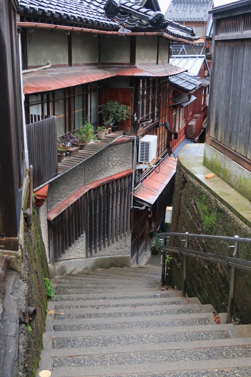 二つの坂は、城下町の中心地だった尾張町界隈と主計町茶屋街を「こっそり」結ぶ裏道だ。暗がり坂は久保市乙剣宮の境内と茶屋街を結んでおり、旦那衆が人目を避けて茶屋街に通うために使われた。泉鏡花の生家近くでもあり、鏡花も通ったという。あかり坂は五木寛之の命名。暗がり坂と平行に走っており、同様な用途だったのだろう。狭く急な坂だが、下りてみれば急に華やかな茶屋街が広がる「どこでもドア」のような坂だ。