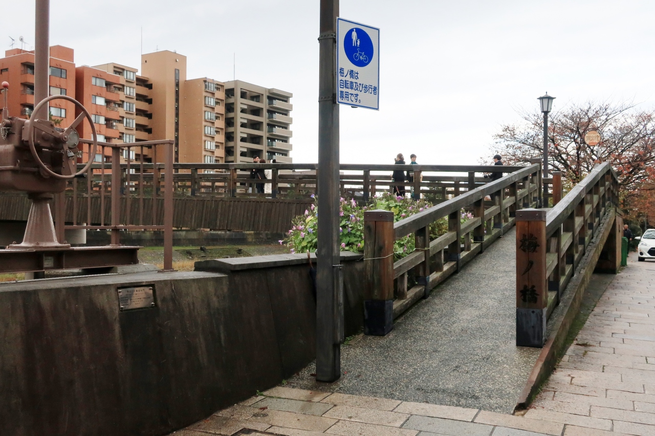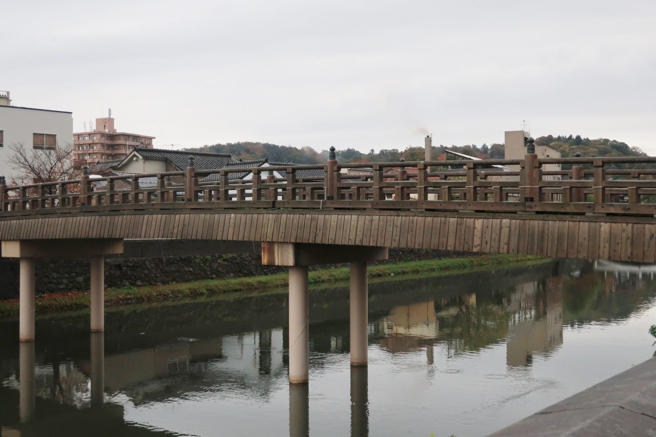 三十間長屋へと導く扇形の木橋だ。戦国時代、金沢城があった場所には一向一揆の北陸の拠点である金沢御堂が存在しており、信者が念仏を唱えながら極楽浄土を願って渡ったことからこの名がついたとされる。現在の公園は主に前田加賀藩時代の遺構を慎重に考証しながら再建しているが、この橋だけは金沢城の前史といえる時代のものを再建している。