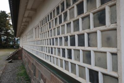 金沢城には江戸時代のなまこ壁が多数現存している。壁に四角い平らな瓦を貼りつけたもので、瓦の目地を白しっくいで盛り上がるように固めている。土蔵や町家ではひし形のなまこ壁をよく見かけるが、金沢城は「品」字に組み上げてあるのが特徴だ。積雪や防火対策のほか、鉄砲の弾よけとして施工されたという。無数のなまこ壁は城を壁模様のようで、意匠的にも大きな特徴になっている。