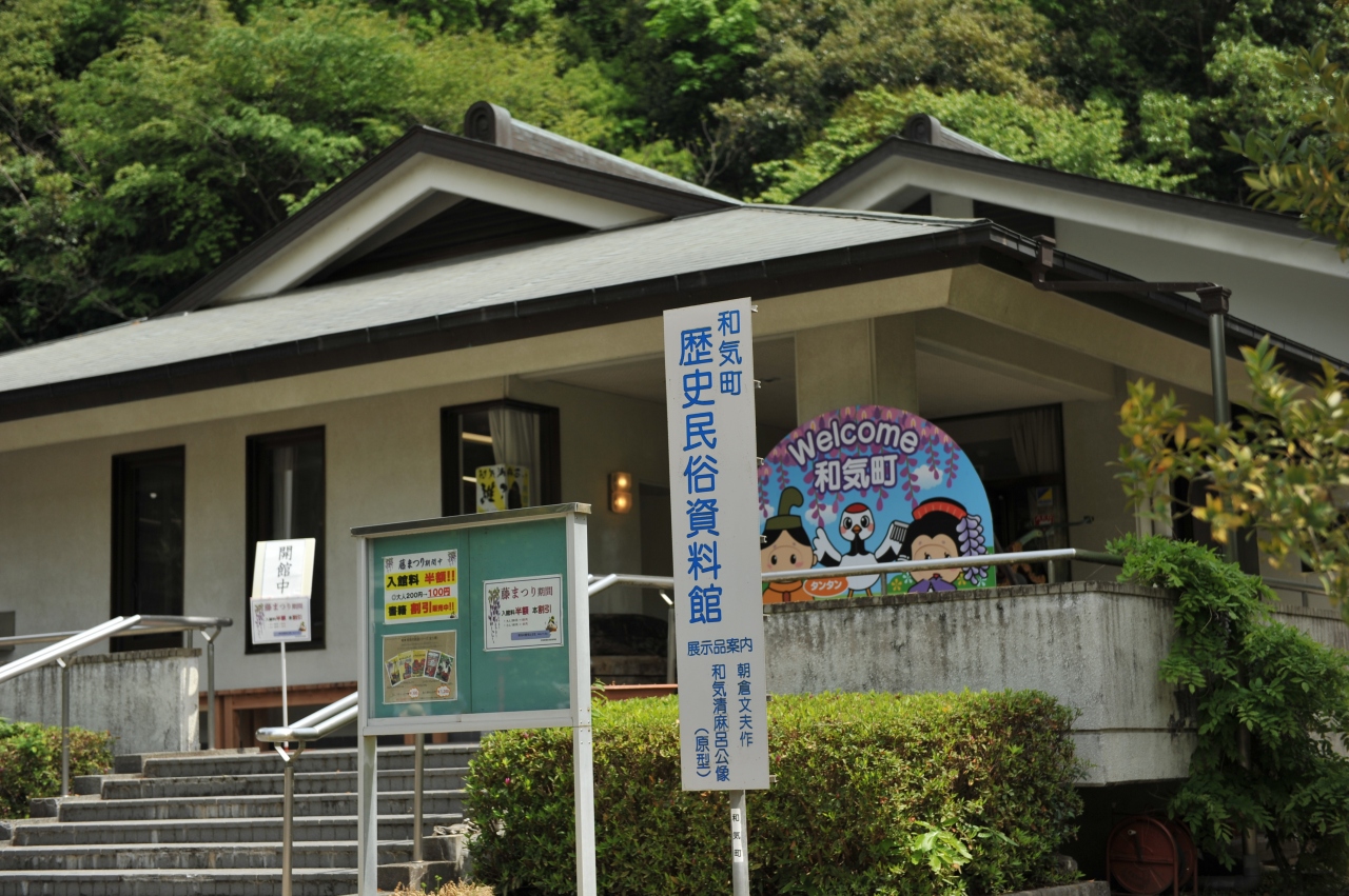 岡山県和気町の和気神社や藤公園のそばにある施設だ。通例、町の民俗資料館といえば農器具など生活用具が集まっているものだが、ここは宇佐八幡宮神託事件の主人公の一人であり、事件後に栄達を果たした和気清麻呂の事績を知らせる施設としても機能している。
