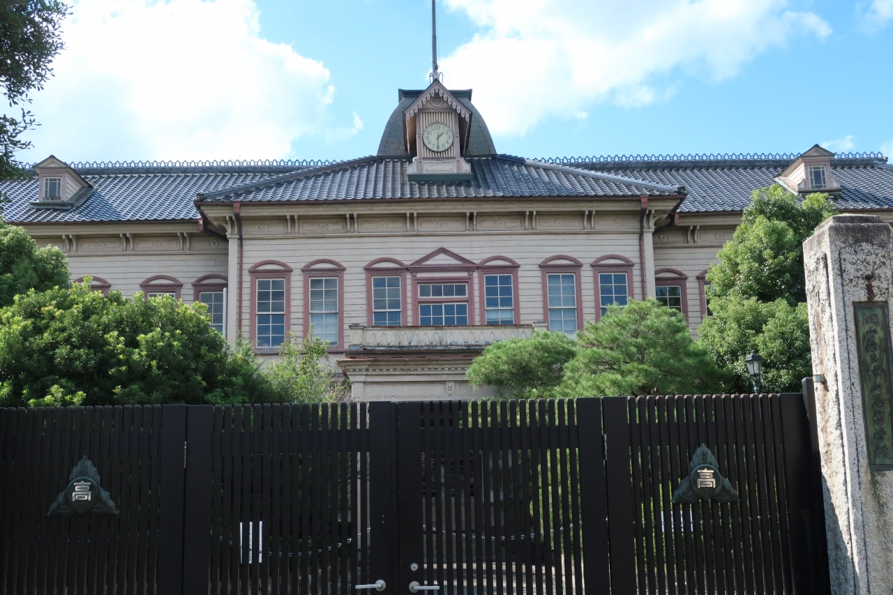 遠くに津山城址を望む住宅街にある校舎だ。初めて見た時、大学の前身である旧制の高等学校の校舎ではないかと思わせる風格を感じた。明治28年に旧制中学校として開設されたという。高校の敷地内だけに観光地ではなく、つぶさに見学はできない。が、地方都市でありながらこれだけの建物を旧制中学校に用意したこと、そしてそれを現在まで使い続けていること。学問が盛んだった津山の伝統を強く感じさせる建築物だ。