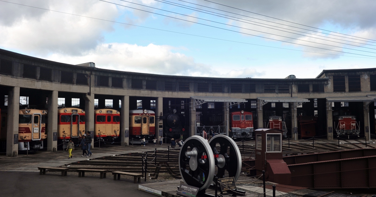 扇形車庫なんて古いイメージの漢字が与えられているが、ぞくぞくするような未来形の列車車庫だ。この施設が観光資源になる、と思いついた人は誰だろう。センスあふれる観光人に違いない。住宅地を抜けると、いきなり「津山のまなびの鉄道館」が姿を現わす。本来は駅の裏側の<裏方>的な施設だったのだが、時代の変遷でスポットライトを浴びるようになった。超横長で写真が難しい。転車台の後ろに回って写真を撮ってみたいが、立ち入り禁止。悩ましい角度で、満足いかない写真を何枚も撮ってしまった。また、行きたくなってしまう。