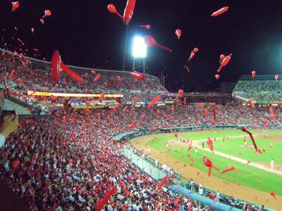 決してカープファンではないものの、楽しい時間が過ごせた。新しくいい球場だと思う。一塁側のパーティフロアから観戦したが、ライトスタンドから眼下の一塁側、バックネット、三塁側と赤いユニホームを着たファンが埋め尽くす。ホームなのにビジターのユニホームで応援するのはなぜだろう。この日は雨が降ったので分かったが、レインウエアも赤なのだ。以前、甲子園に何度か足を運んだことがあるが、応援団にあまりいい印象を抱かなかった。広島のファンも熱心さでは負けないかもしれないが、どこかさわやかだ。この球場にいて気持ちがいいのは、そんなことも作用しているのだろう。もう少しチケットが簡単に取れれば、いい観光資源だ。