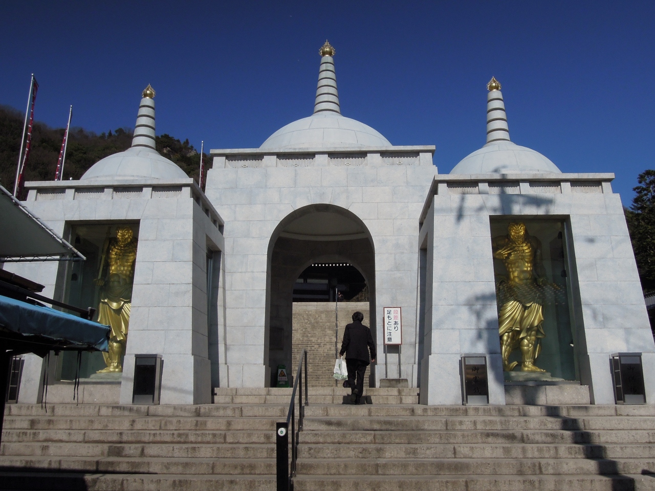 名前こそお稲荷さんだが、その実はお寺さんだ。典型的な神仏習合の日蓮宗寺院。パンフレットによると、伏見、豊川と並ぶ日本三大稲荷を自称する。寺勢は華やかで、参拝するたびに新しい近代的な建物が増えているようだ。中でも初詣、節分祭は大にぎわいで、県内屈指の人出を誇る。混雑時の悩みは、誰もが書いているように駐車場。公共交通があまり便利ではないだけに誰もが車を選ぶが、特に初詣時は空きを探すのが大変だ。通常は仁王門近くの駐車場にとめることができる。参拝すると、最も驚かされるのが、仁王門。平成25年に建てられたらしいが、何とコンクリート製なのだ。ショーウインドーのようにガラスがはめ込まれ、ライトアップされた黄金の仁王像がにらみを利かせている。デザインもインドの殿堂のようで圧倒される。境内はお参りする新しい本殿エリアと文化財が多い旧本殿エリアという、今昔の建築物がそれぞれ集まる二つのエリアに大別される。参拝以外に本殿ゾーンの売店、旧本殿の縁の本社は足を運んでみたい場所だ。