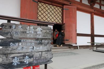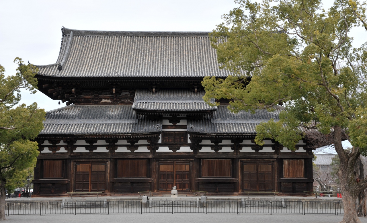 平城京に向けてにらみを利かせているかのような建物が南大門だ。東寺にいくつかある門の中でも飛びぬけて大きい。京都には神社仏閣城郭の間で門を玉突き人事のようにトレードする例があるが、この門も元々三十三間堂(蓮花王院)の西門として1601年に建てられたものだった。東寺の南大門が焼失したため、1895年に移築したという。幅約18メートル、高さ約13メートル、三間の八脚門。金堂、講堂、五重塔など名だたる建築物の皮切りとしてふさわしい威容だ。