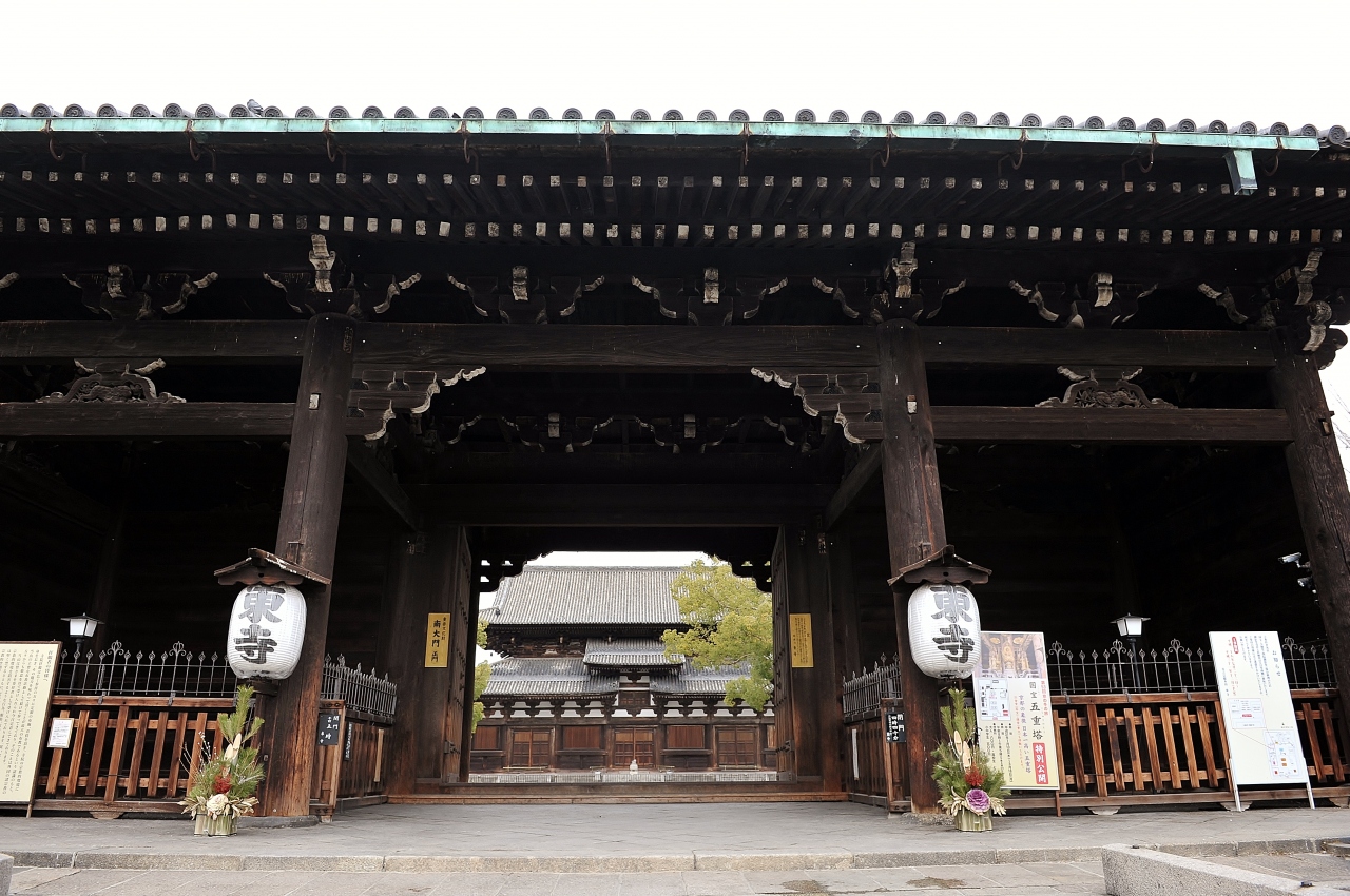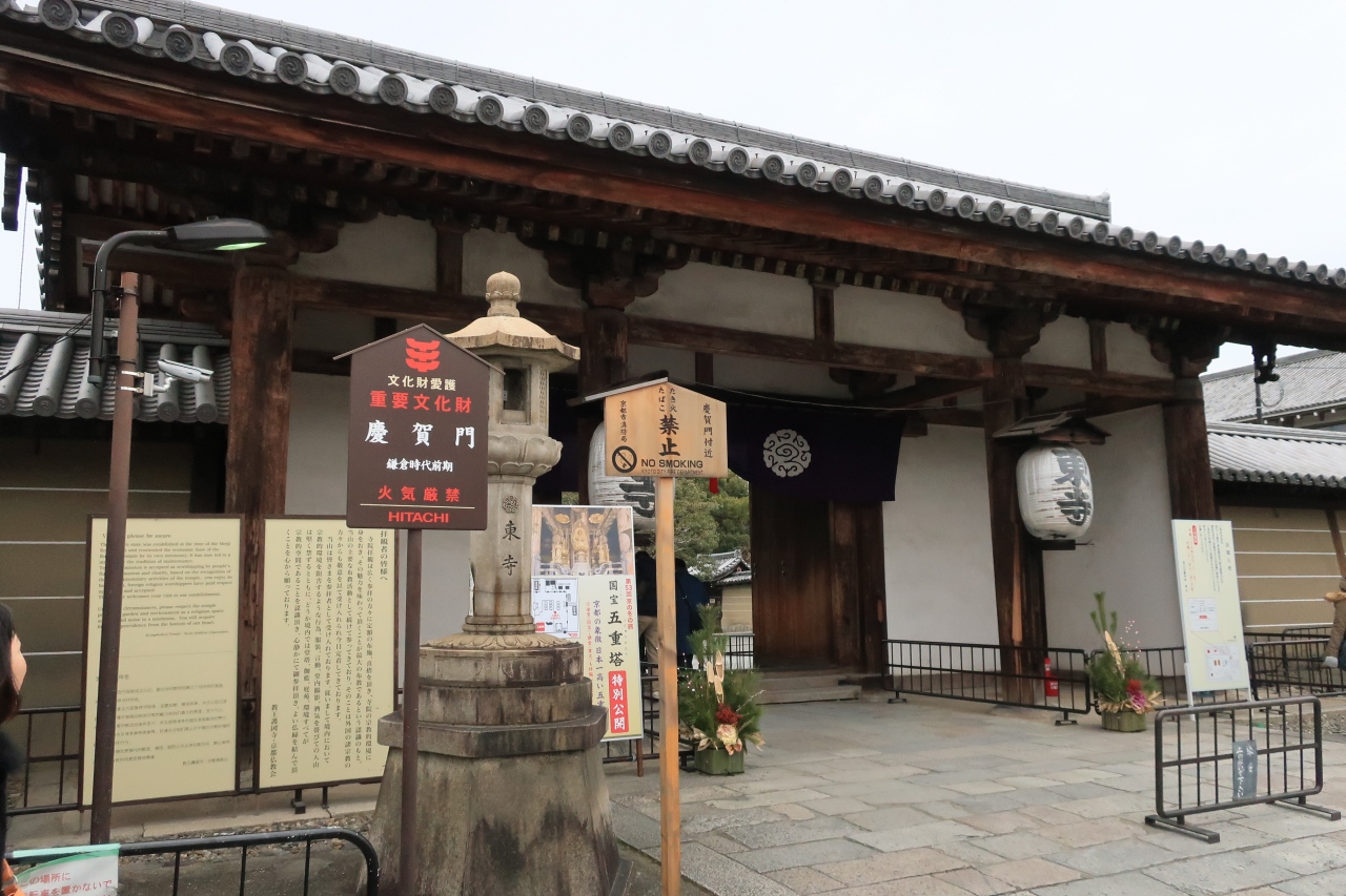 観光客が最も通る門だ。バス停が近くにあるほか、JR京都駅や近鉄から歩いてくると「最寄り」の門になるからだ。東寺の正門は南大門だが、この門は城郭で言えばからめ手門だろうか。本来であれば東大門が「からめ手」の役割を果たすのだろうが、ご存じ東寺の七不思議で不開門だけに、慶賀門が用いられているのだろう。また、慶賀門の名前の由来を探したがわからなかった。伏見稲荷の神輿をこの門から迎えるからだろうか。あるいは北東にある鬼門封じで、めでたい名前を付けたのだろうか。