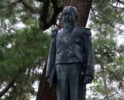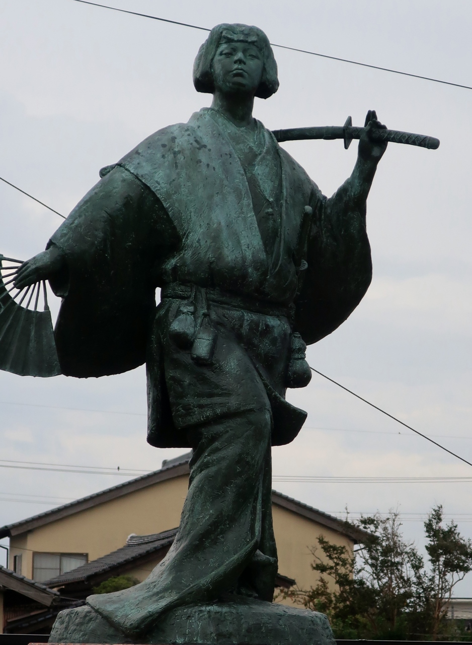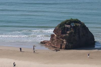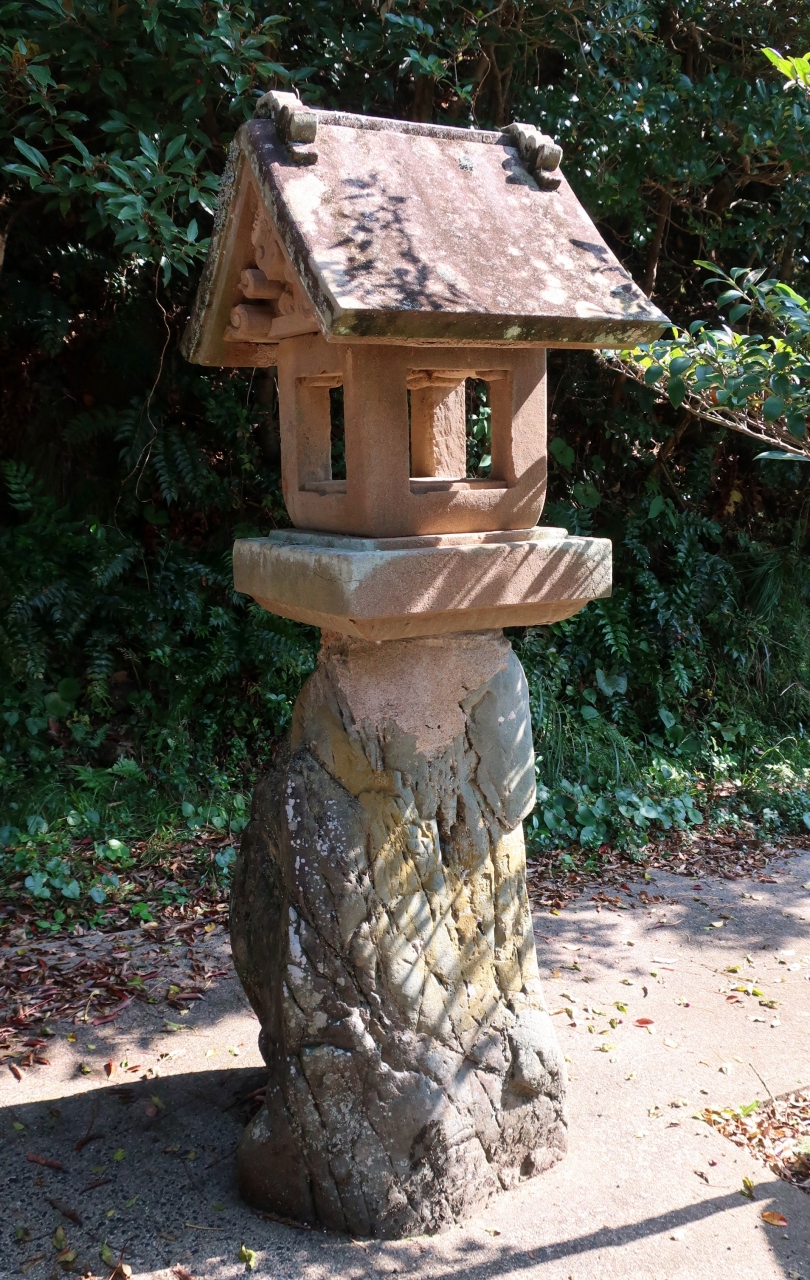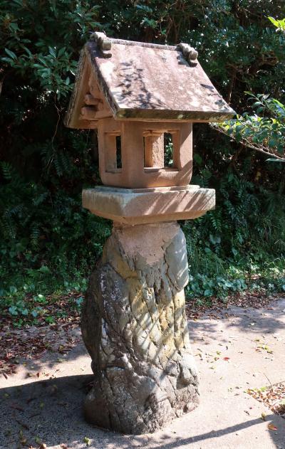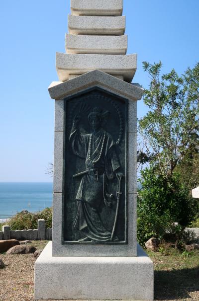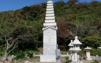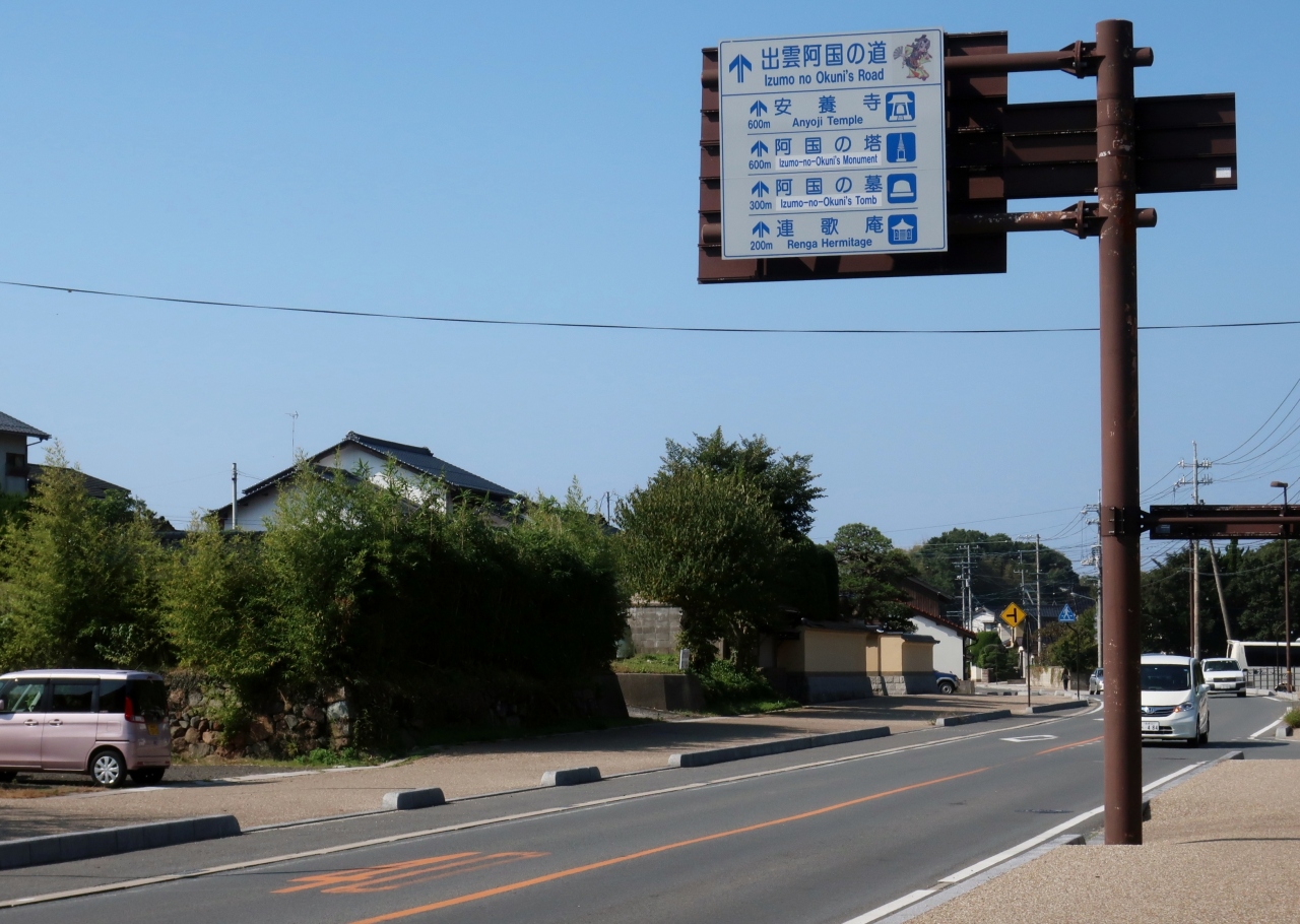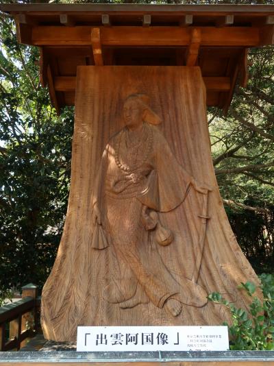 歌舞伎の創始者である出雲阿国を顕彰するモニュメントだ。1936(昭和11)年に地元の代議士の尽力により建立された。七重の屋根を持つ石塔で、正面には当時貴族院議長を務めていた近衛文麿による「於国塔」の揮毫が刻まれ、背面には阿国の姿の銅板レリーフが飾られた。周辺には建立に協力した水谷八重子や歌舞伎の中村家、市川家などの役者の名前が刻まれている。出雲大社から稲佐浜へ向かう道すがら、少し山に登ったところにある。現在の塔は昭和43年に再建されたもの。周辺には阿国が暮した庵や墓がある「阿国のエリア」だ。