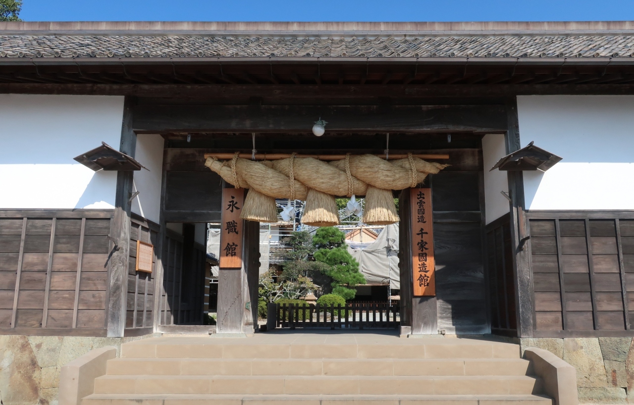 神在月に神々が稲佐の浜にたどり着き、そこから出雲大社に向かうルートが神迎の道だ。この美術館はその道沿いにある。手錢家は代々この地で続いた醸造家で、美術館は酒蔵と米蔵を生かして開設されたという。訪れた時は松江藩主の不昧公の企画展や出雲地方に伝わる茶道の名器などを展示していた。地元の素封家のコレクションという感じだ。