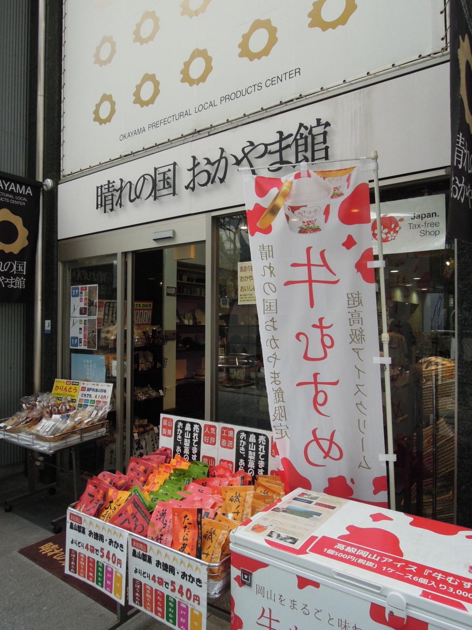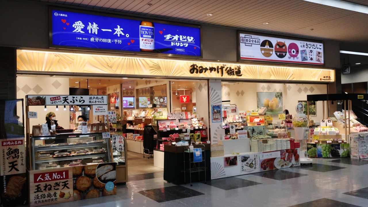 おみやげ街道はJR西日本のおみやげ店のニックネーム。「桃太郎」はJR岡山駅新幹線構内にある土産物店だ。最大の特徴は岡山だけでなく、四国の瀬戸内側の土産物も扱っている点だろう。讃岐うどんやじゃこ天などが桃やブドウ、キビ団子と同様に店頭に並んでいるのだ。讃岐うどんは品ぞろえも豊かで、専用の醤油まで売っている。もちろん駅弁も瀬戸内の味だ。中四国の結節点らしいおみやげ店だ。